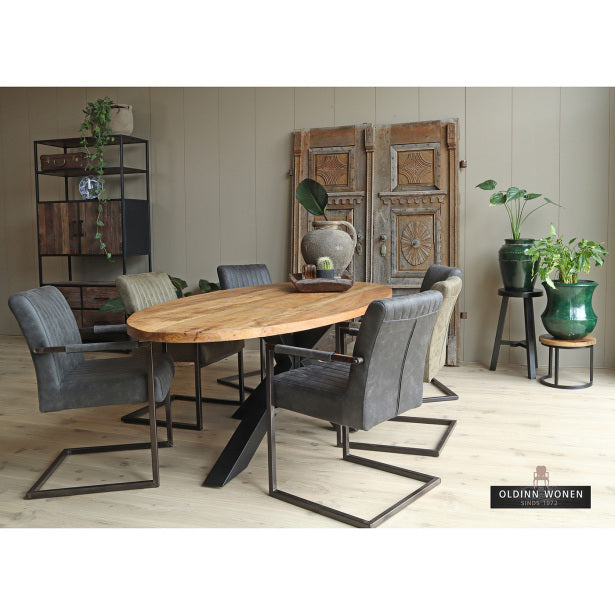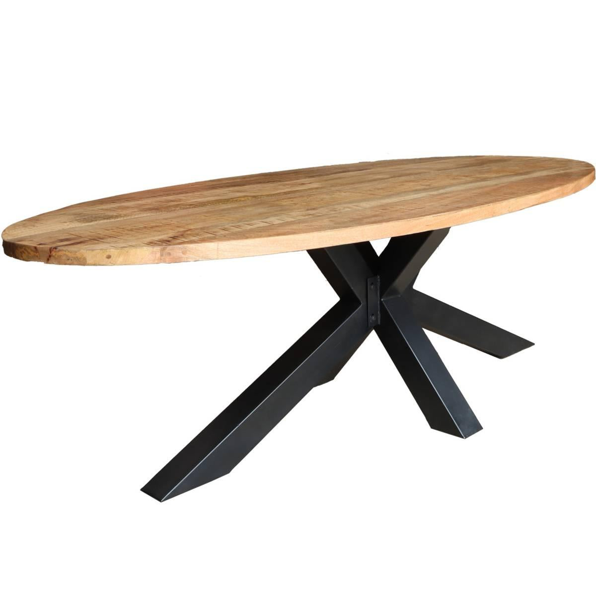 Eettafel ovaal voor 6 personen met een tafelblad van mangohout. De bruine eettafel heeft een industriële uitstraling met een zwarte metalen spinpoot.