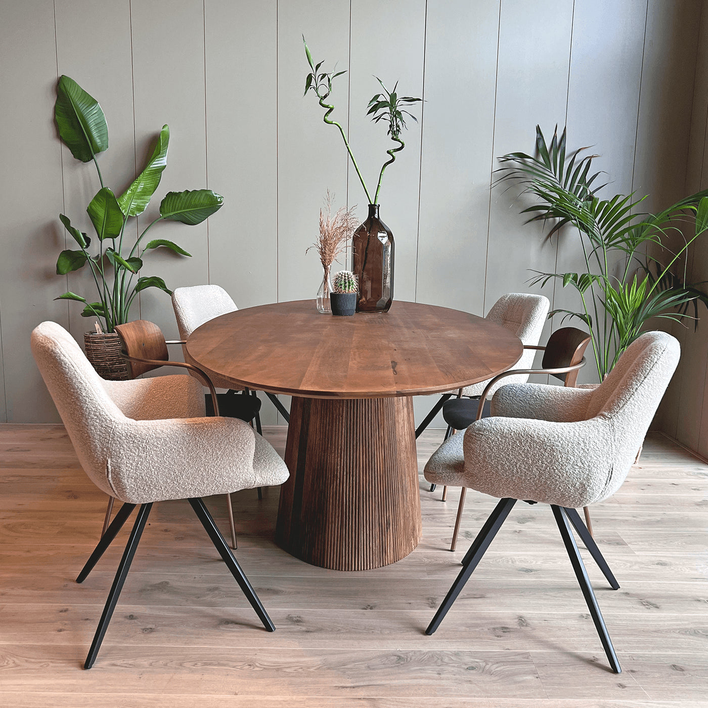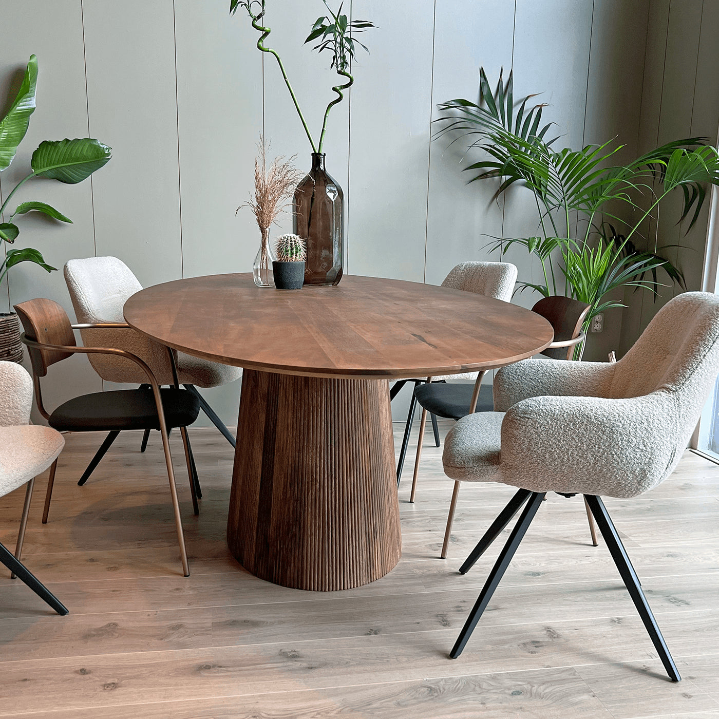 Eetkamertafel Rome is een prachtige ovale eettafel vervaardigd uit hoogwaardig mangohout, afgewerkt in een warme bruine kleur. Met een lengte van 240 cm biedt deze tafel voldoende ruimte om meer eetkamerstoelen te plaatsen, waardoor het de perfecte keuze is voor gezellige diners en familiemaaltijden. Het unieke ontwerp, met zowel een ovaal blad als een ovale poot, beide gemaakt van mangohout, zorgt voor een harmonieuze en verfijnde uitstraling.