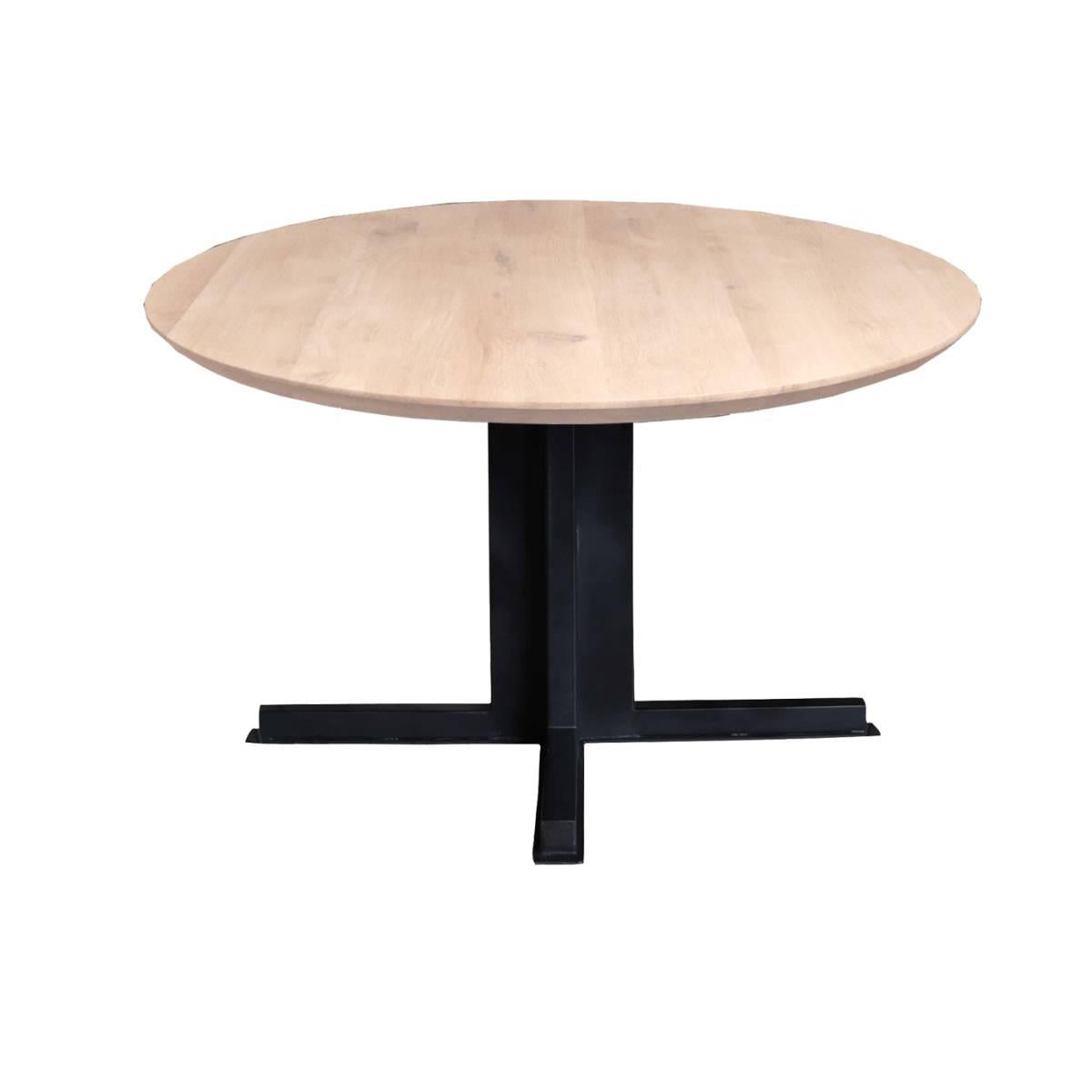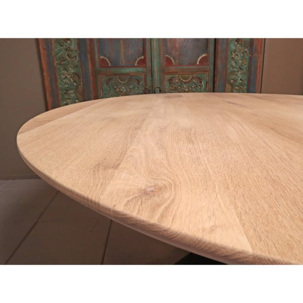 Het mooie schuin afgewerkte blad is van onbehandeld eikenhout en is 4 cm dik. De ronde tafel is weer helemaal terug van weggeweest! Deze mooie ronde tafel heeft een tafelblad met een facet rand. Dit is een schuine tafelrand. De bruine eettafel heeft een industriële uitstraling dankzij het prachtige tafelblad van onbewerkt eikenhout en de zwart metalen pluspoot. Het combineren van een eikenhouten blad met een zwart metalen onderstel geeft een mooie industriële look. In tegenstelling tot mangohout en acaciahout heeft eiken een rustige naturel uitstraling.