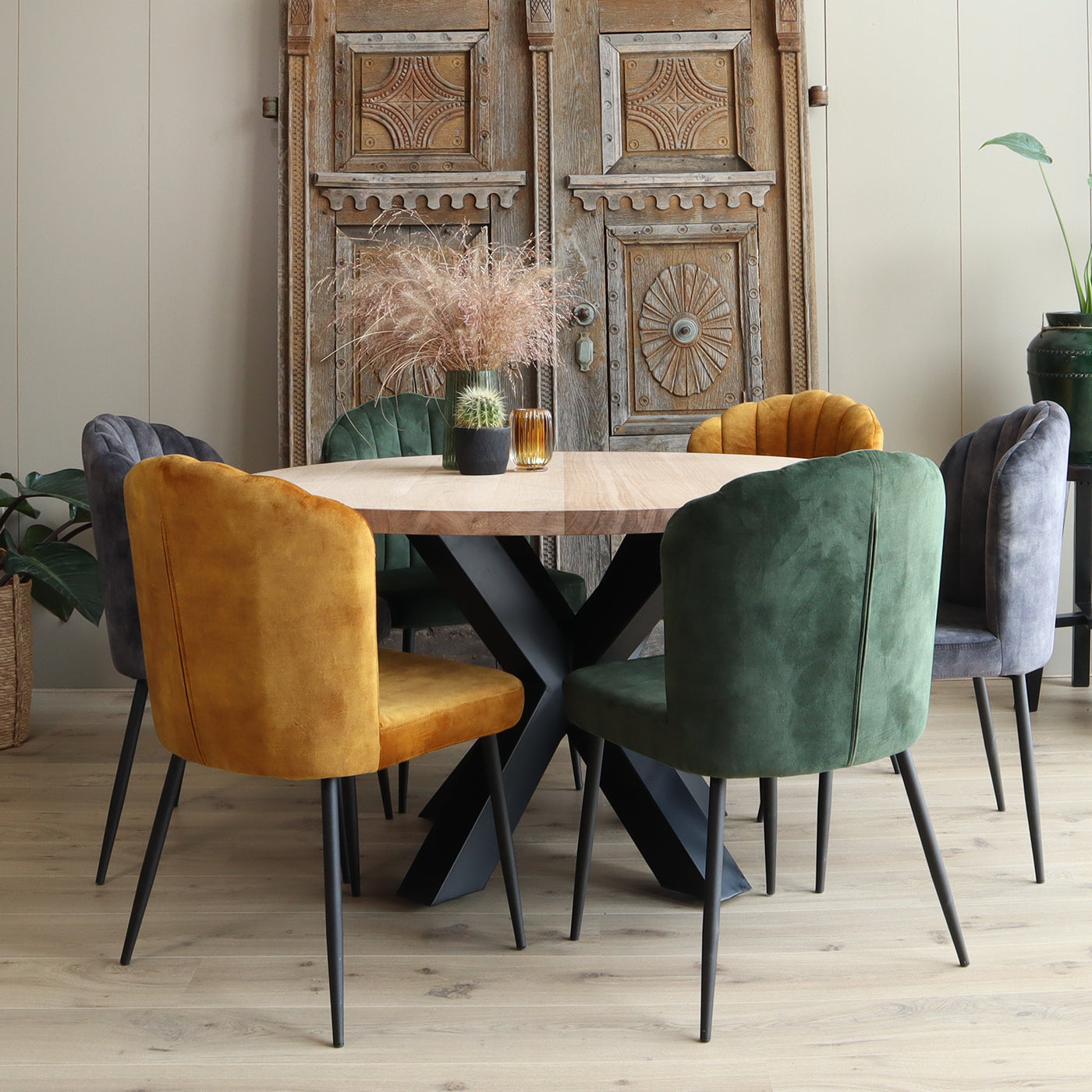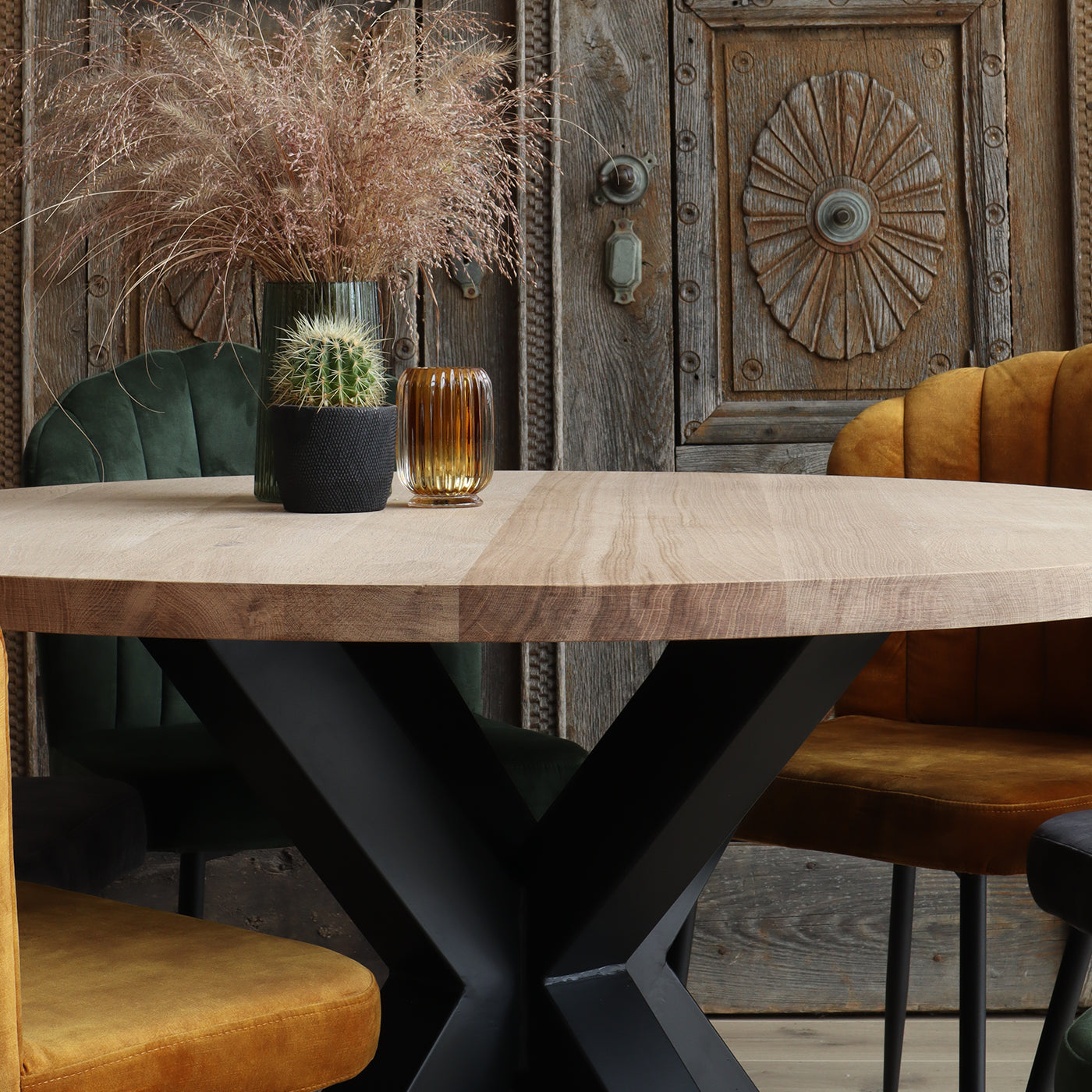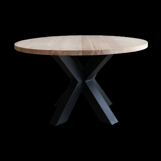 De ronde tafel is weer helemaal terug van weg geweest. Deze uitvoering van onbehandeld eikenhout in combinatie met de unieke zwart metalen sterpoot geeft de tafel een landelijke en industriële uitstraling. In tegenstelling tot mangohout en acaciahout heeft eiken een rustige naturel uitstraling.