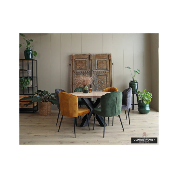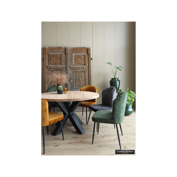De ronde tafel is weer helemaal terug van weg geweest. Deze uitvoering van onbehandeld eikenhout in combinatie met de unieke zwart metalen sterpoot geeft de tafel een landelijke en industriële uitstraling. In tegenstelling tot mangohout en acaciahout heeft eiken een rustige naturel uitstraling.