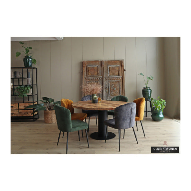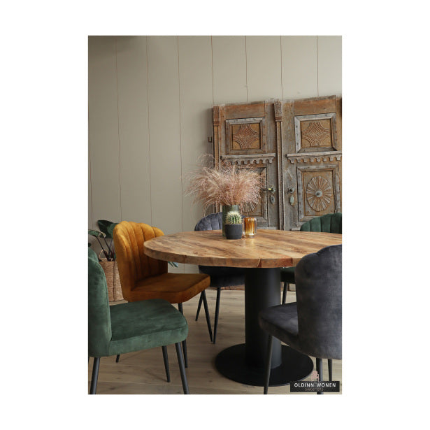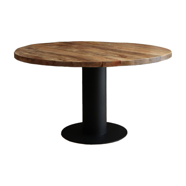 Ronde eettafel voor 6 personen met een tafelblad van mangohout. De bruine eettafel heeft een industriële uitstraling dankzij de zwart metalen kolompoot en het prachtige tafelblad van mangohout.