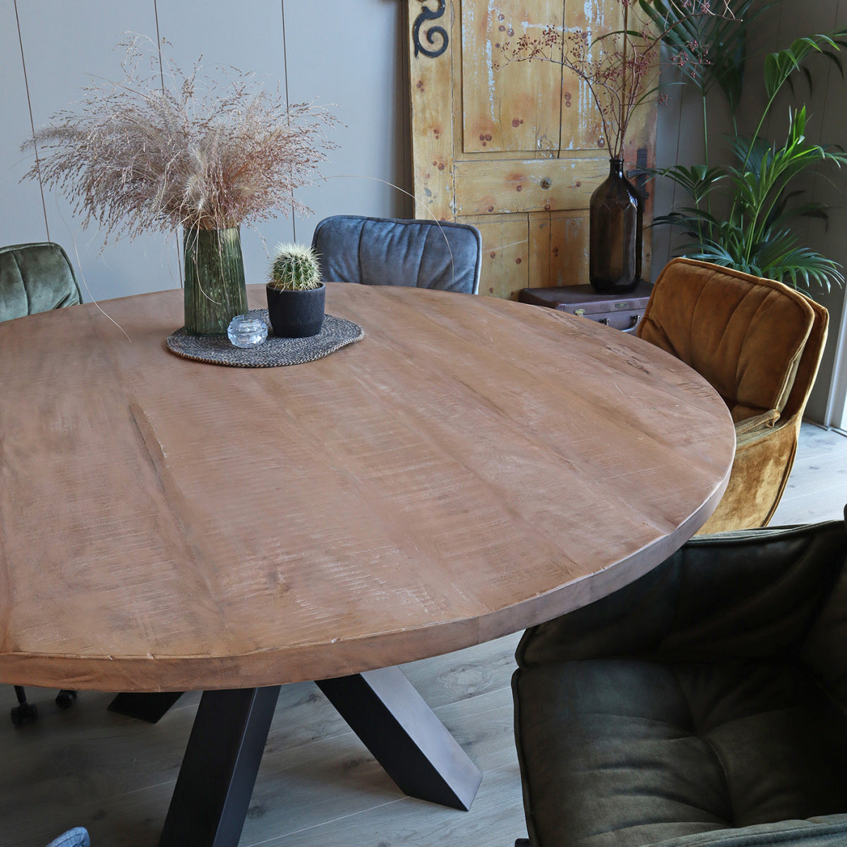 Rond tafelblad 6 personen van massief mangohout met een bladdikte van 4cm.