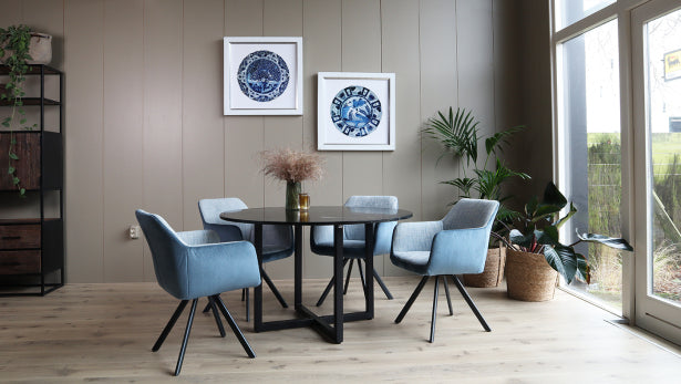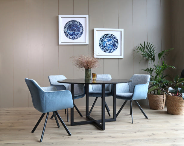 Zwarte ronde eettafel met marmeren tafelblad voor 4 personen