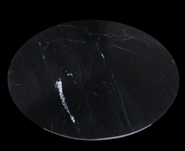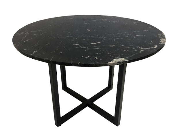 Ronde eettafel voor 4 personen met een tafelblad van zwart marmer en een zwart metalen U kruispoot.