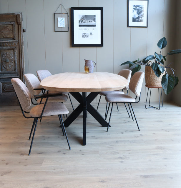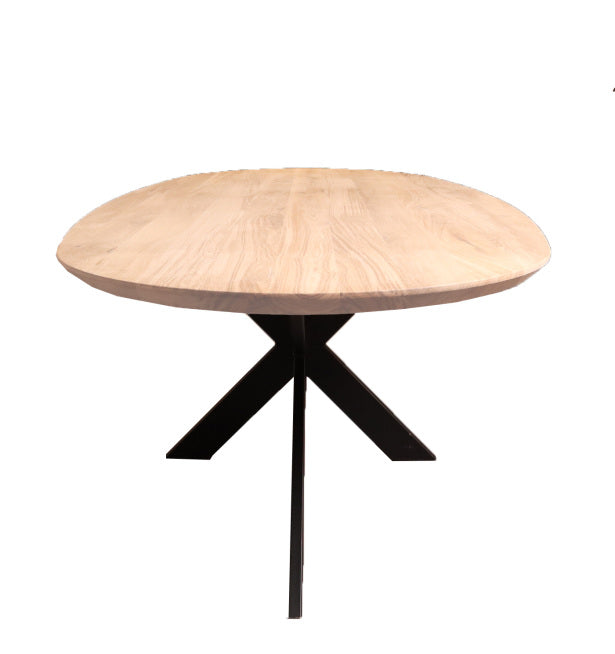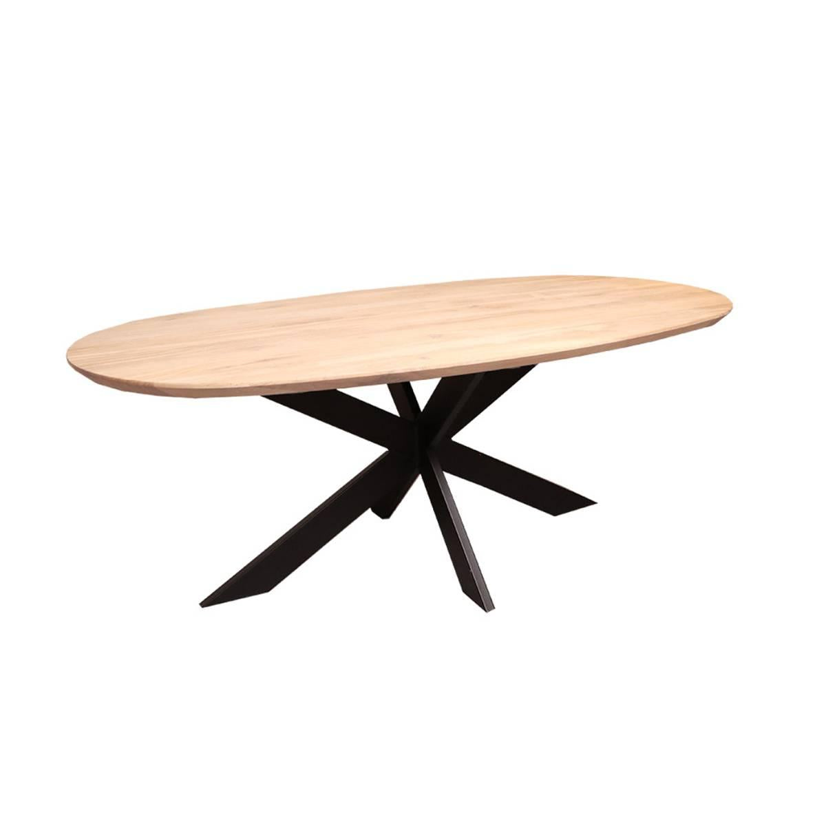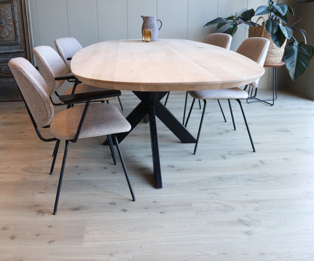 Industriële ovale eettafel met schuine rand van onbewerkt eikenhout ✓ Type tafel: Eettafel ✓ Vorm tafelblad: Deens ovaal met schuine facet rand ✓ Materiaal tafelblad: Eikenhout ✓ Kleur tafelblad: Naturel ✓ Afwerking tafelblad: Onbehandeld ✓ Dikte tafelblad: 4cm ✓ Type onderstel: Spinpoot ✓ Materiaal onderstel: Staal ✓ Kleur onderstel: Zwart ✓ Aantal personen: 6 ✓ Lengte x Breedte x Hoogte: 240x110x76cm ✓ Merk: Old Inn Wonen