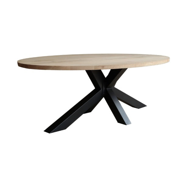 Industriële ovale eettafel van onbehandeld eikenhout ✓ Type tafel: Eetkamertafel ✓ Vorm tafelblad: Ovaal Almond, Spits Ovaal ✓ Materiaal tafelblad: Massief eikenhout ✓ Kleur tafelblad: Naturel, lichtbruin ✓ Afwerking tafelblad: Onbehandeld ✓ Dikte tafelblad: 4cm ✓ Type onderstel: Spinpoot ✓ Materiaal onderstel: Metaal ✓ Kleur onderstel: Zwart ✓ Aantal personen: 6 ✓ Lengte x Breedte x Hoogte: 240x110x76cm ✓ Merk: Old Inn Wonen