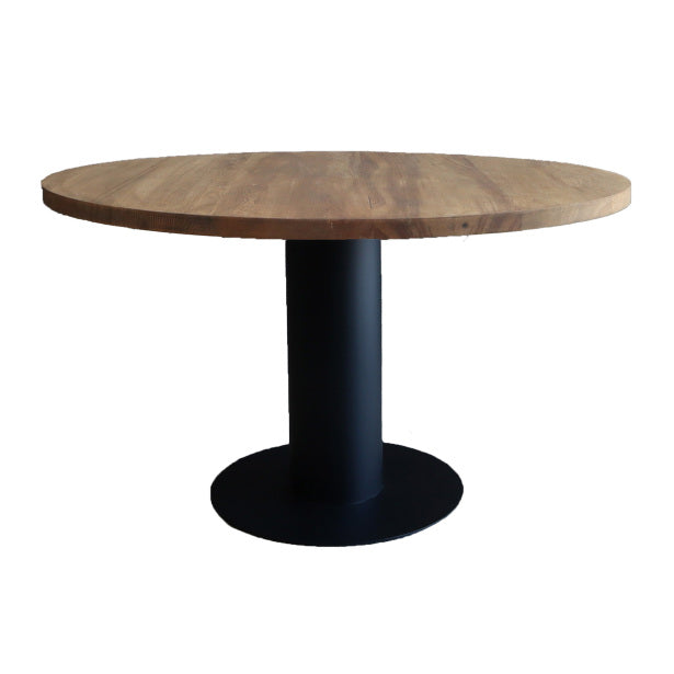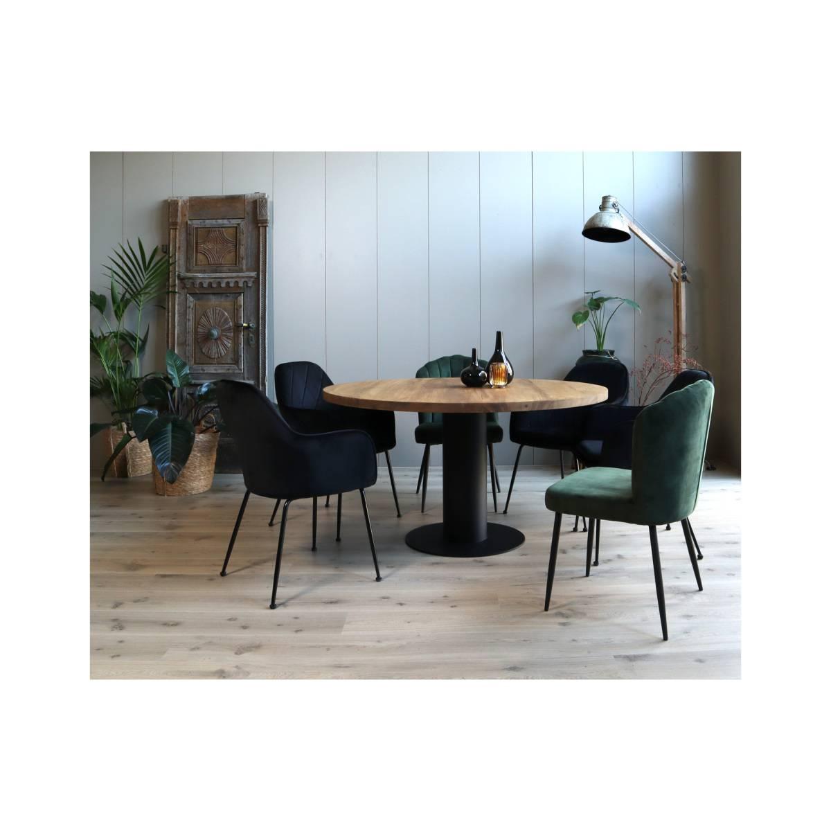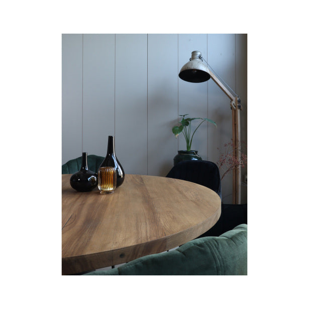 De ronde tafel is weer helemaal terug van weg geweest. Deze uitvoering van eikenhout in combinatie met de unieke zwart metalen kolompoot geeft de tafel een landelijke en industriële uitstraling. In tegenstelling tot mangohout en acaciahout heeft eiken een rustige naturel uitstraling.