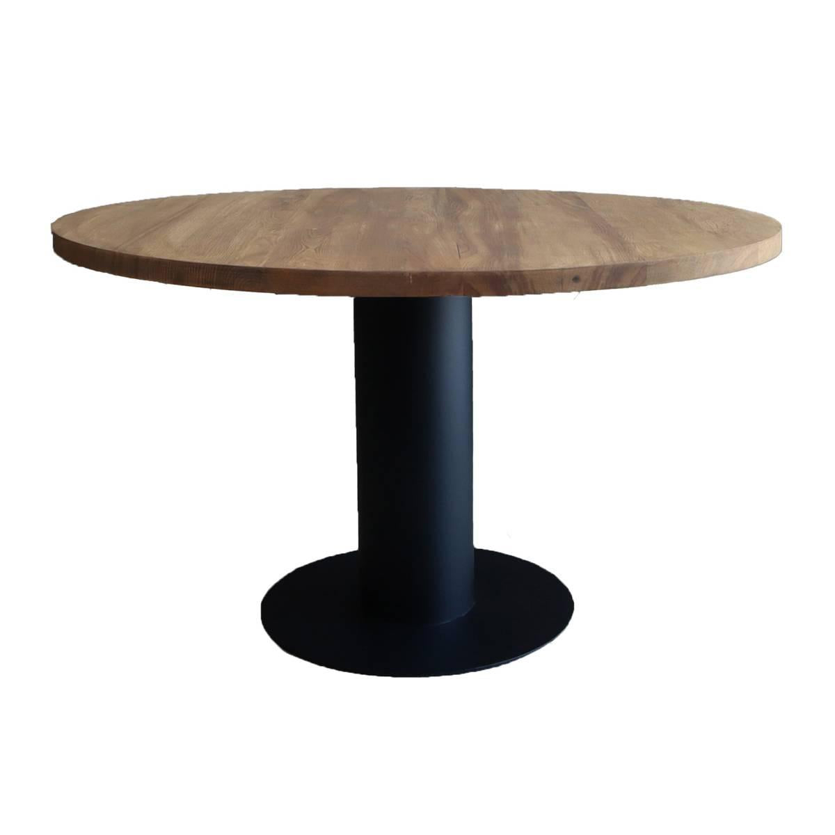 Industriële ronde eettafel van bruin eikenhout ✓ Type tafel: Eetkamertafel ✓ Vorm tafelblad: Rond ✓ Materiaal tafelblad: Massief eikenhout ✓ Kleur tafelblad: Bruin; wordt geleverd met een bruine beits ✓ Afwerking tafelblad: Onbehandeld ✓ Dikte tafelblad: 4cm ✓ Type onderstel: Kolompoot ✓ Materiaal onderstel: Metaal ✓ Kleur onderstel: Zwart ✓ Aantal personen: 8 ✓ Dia x Hoogte: 160x75cm ✓ Merk: Old Inn Wonen