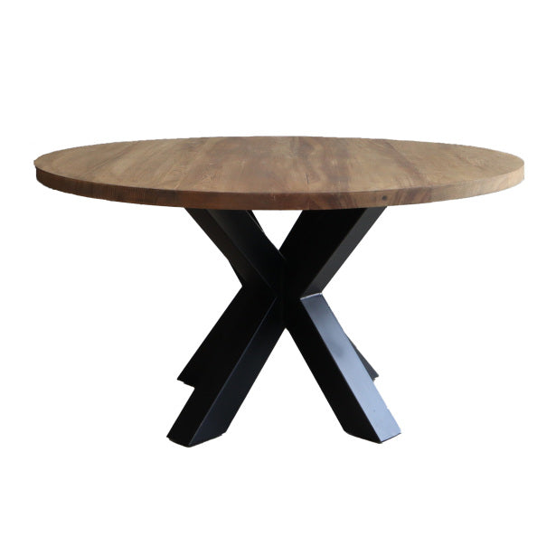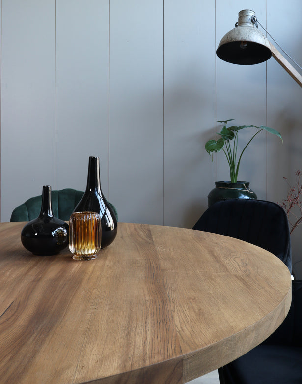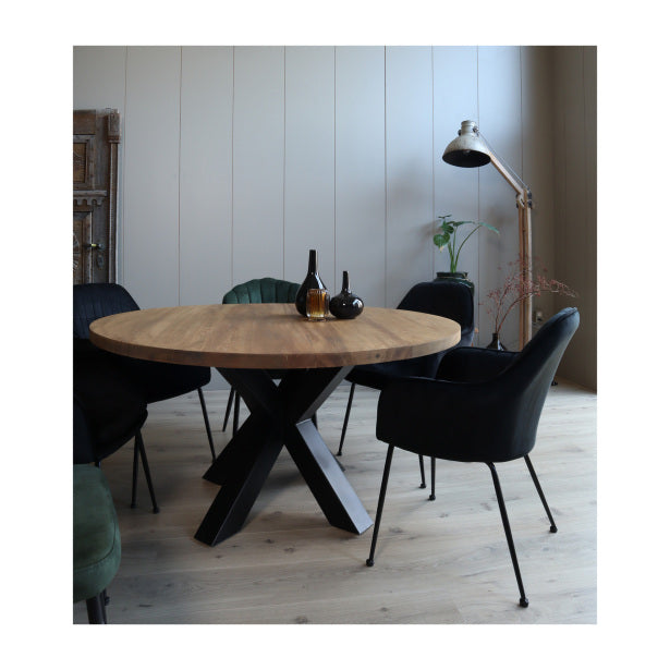 De ronde tafel is weer helemaal terug van weg geweest. Deze uitvoering van eikenhout in combinatie met de unieke zwart metalen sterpoot geeft de tafel een landelijke en industriële uitstraling. In tegenstelling tot mangohout en acaciahout heeft eikenhout een rustige naturel uitstraling.