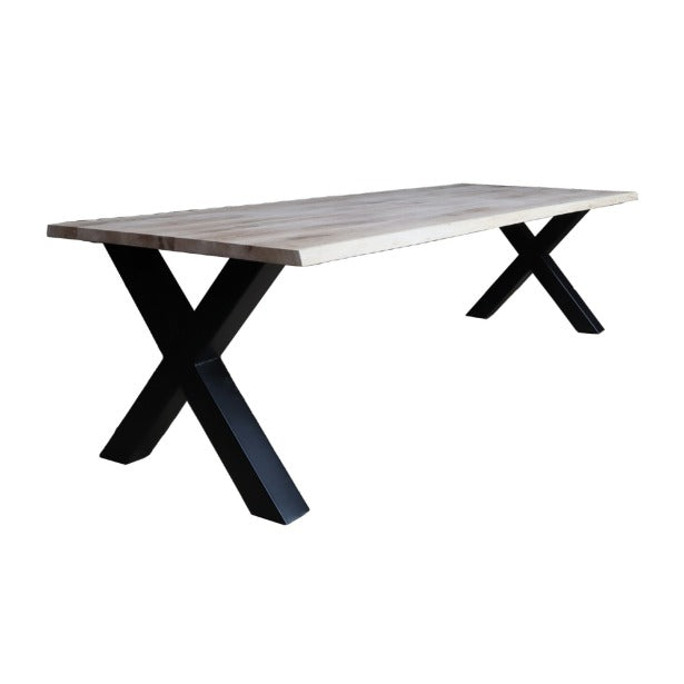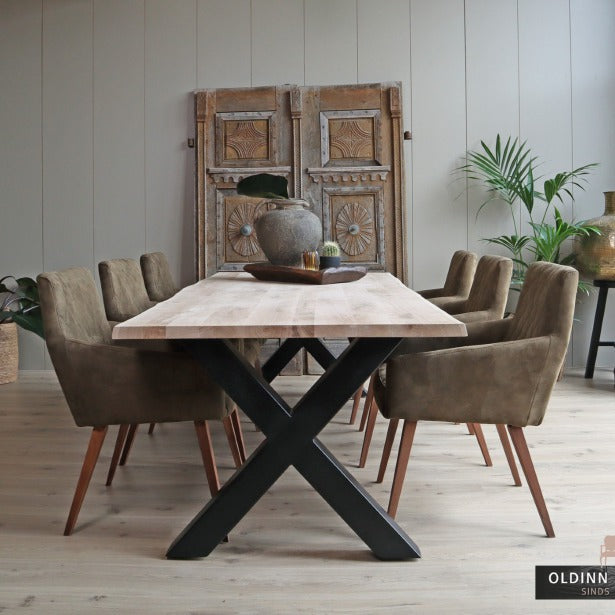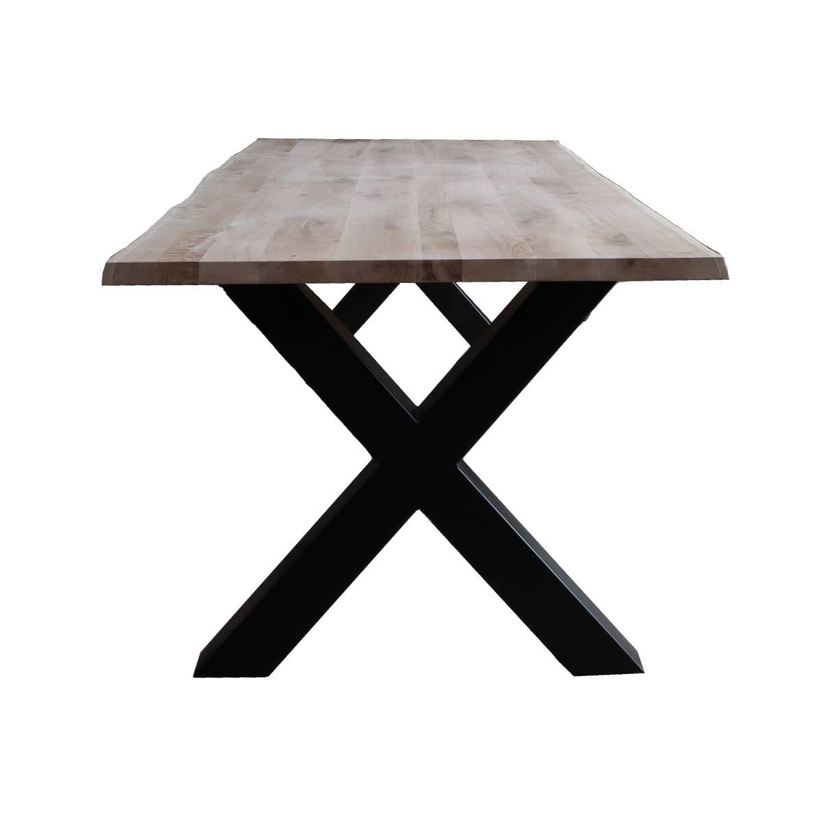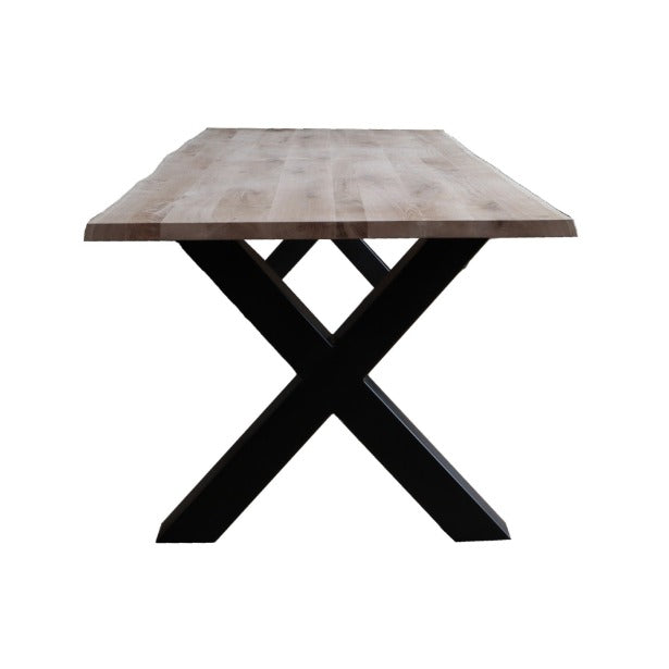 Het eikenhout in combinatie met een zwarte metalen X-poot geeft de tafel een landelijke en industriële uitstraling. Het tafelblad heeft aan de onderzijde van stalen strips die helpen voorkomen dat het blad gaat werken.