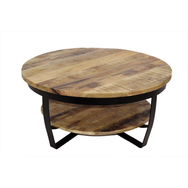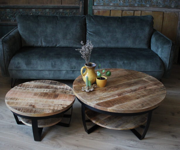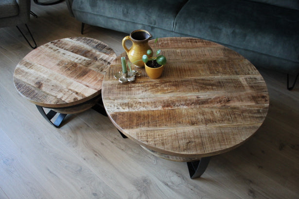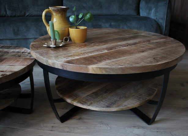Salontafel industrieel rond van massief mangohout ✓ Type tafel: Salontafel ✓ Vorm tafelblad: Rond ✓ Materiaal tafelblad: Mangohout ✓ Kleur tafelblad: Bruin ✓ Afwerking tafelblad: Gelakt ✓ Dikte tafelblad: 4cm ✓ Type onderstel: U-Poten ✓ Materiaal onderstel: Metaal ✓ Kleur onderstel: Zwart ✓ Dia x Hoogte: 90x42cm ✓ Merk: Old Inn Wonen ✓ Leveromvang: Een tafel zonder decoratie.
