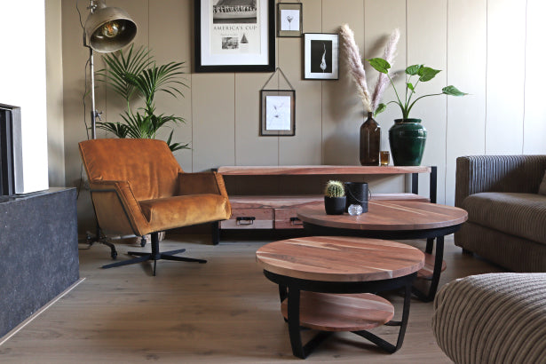 Ronde salontafel met een tafelblad van acaciahout. De bruine salontafel heeft een industriële uitstraling dankzij de houten bladen gemaakt van onbehandeld acaciahout en het zwarte metalen onderstel met extra legruimte.