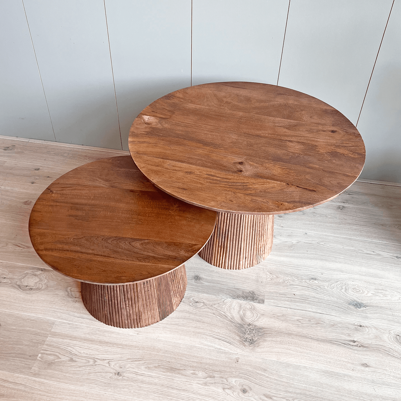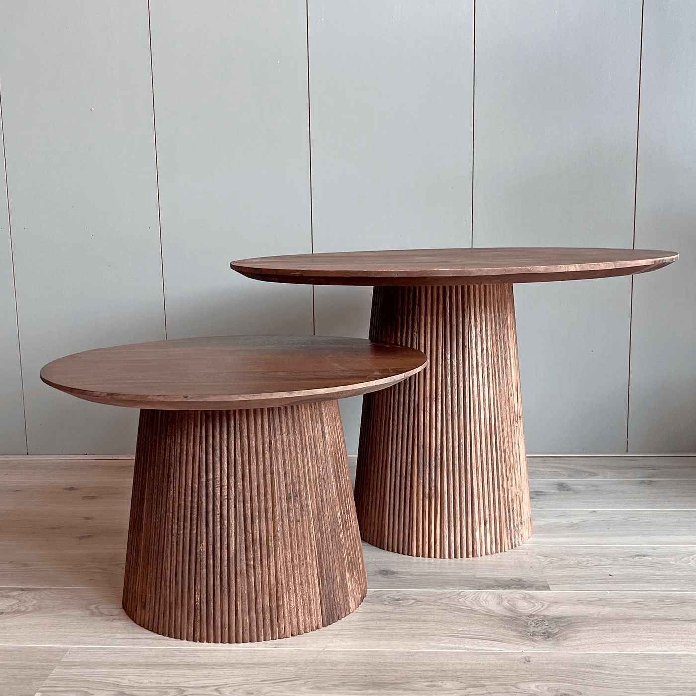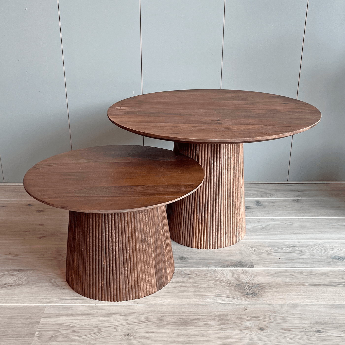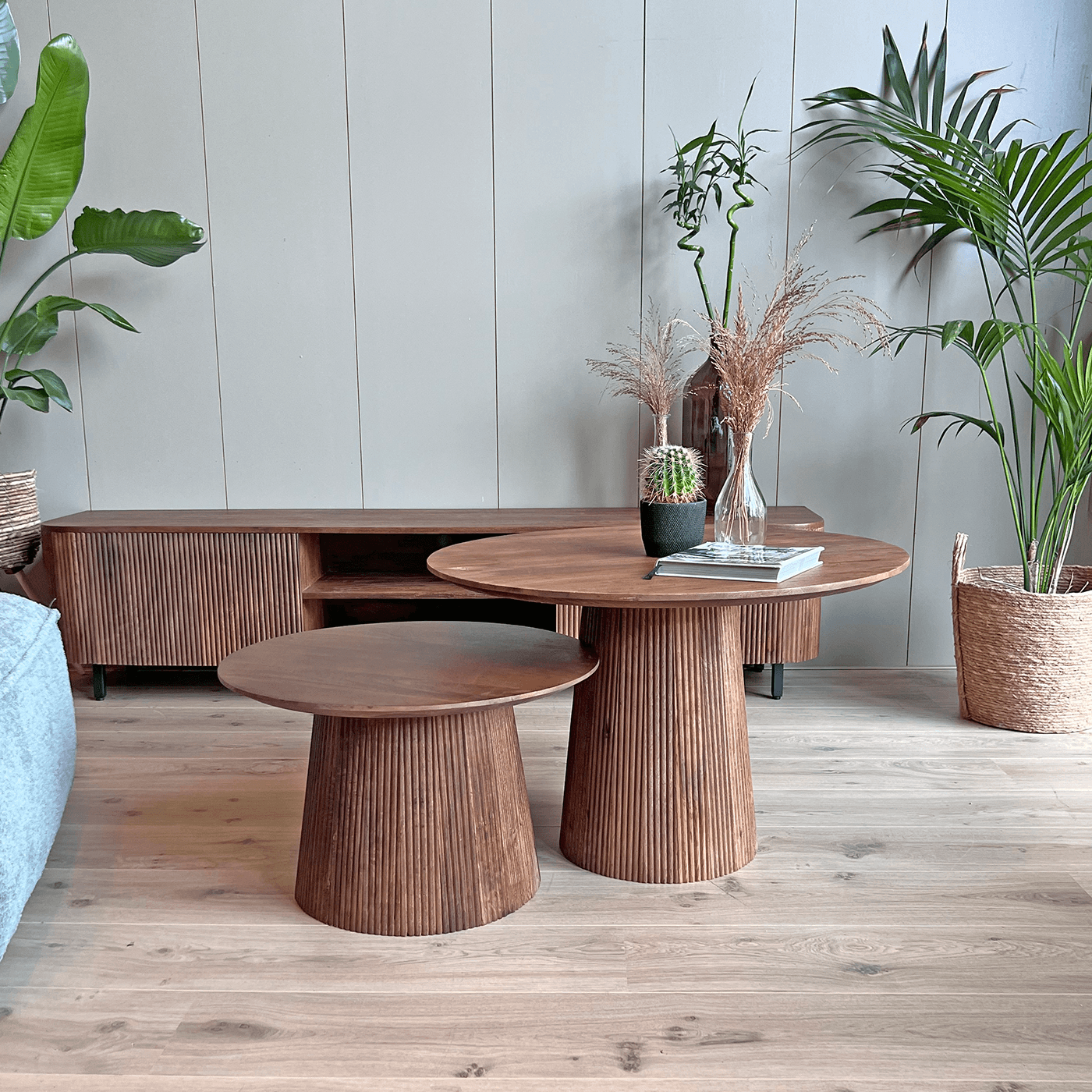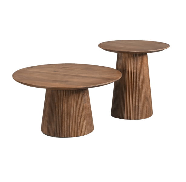 Bent u op zoek naar een salontafel met stijl? Kies dan voor onze salontafelset Rome. Deze set van twee tafels valt op door de verfijnde ronde vormen en is gemaakt van hoogwaardig mangohout met een houten ronde poot. De tafels hebben een diameter van 60 cm en 80 cm, en zijn afgewerkt in een warme bruine kleur. Ze zijn niet alleen functioneel, maar ook een echte eyecatcher in uw woonkamer. Hun elegante ontwerp en natuurlijke houtnerf zorgen voor een sfeervolle en uitnodigende ambiance.