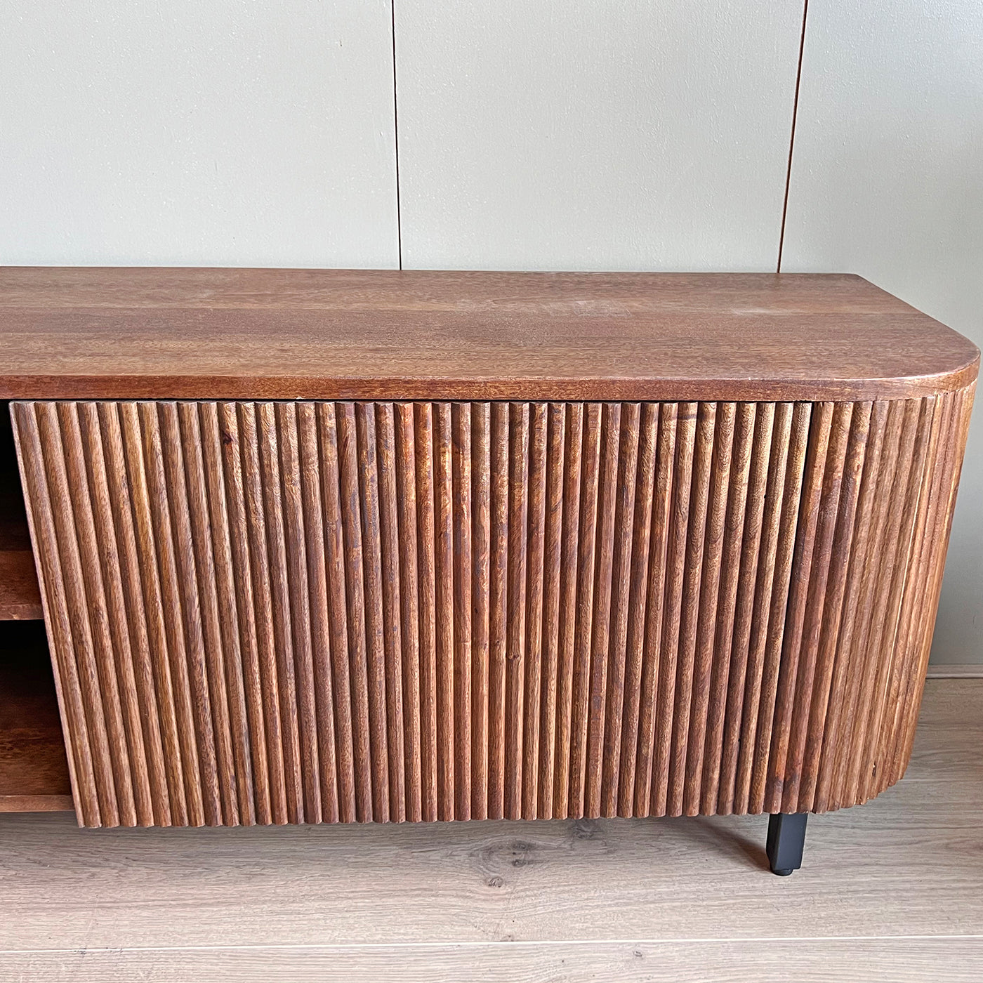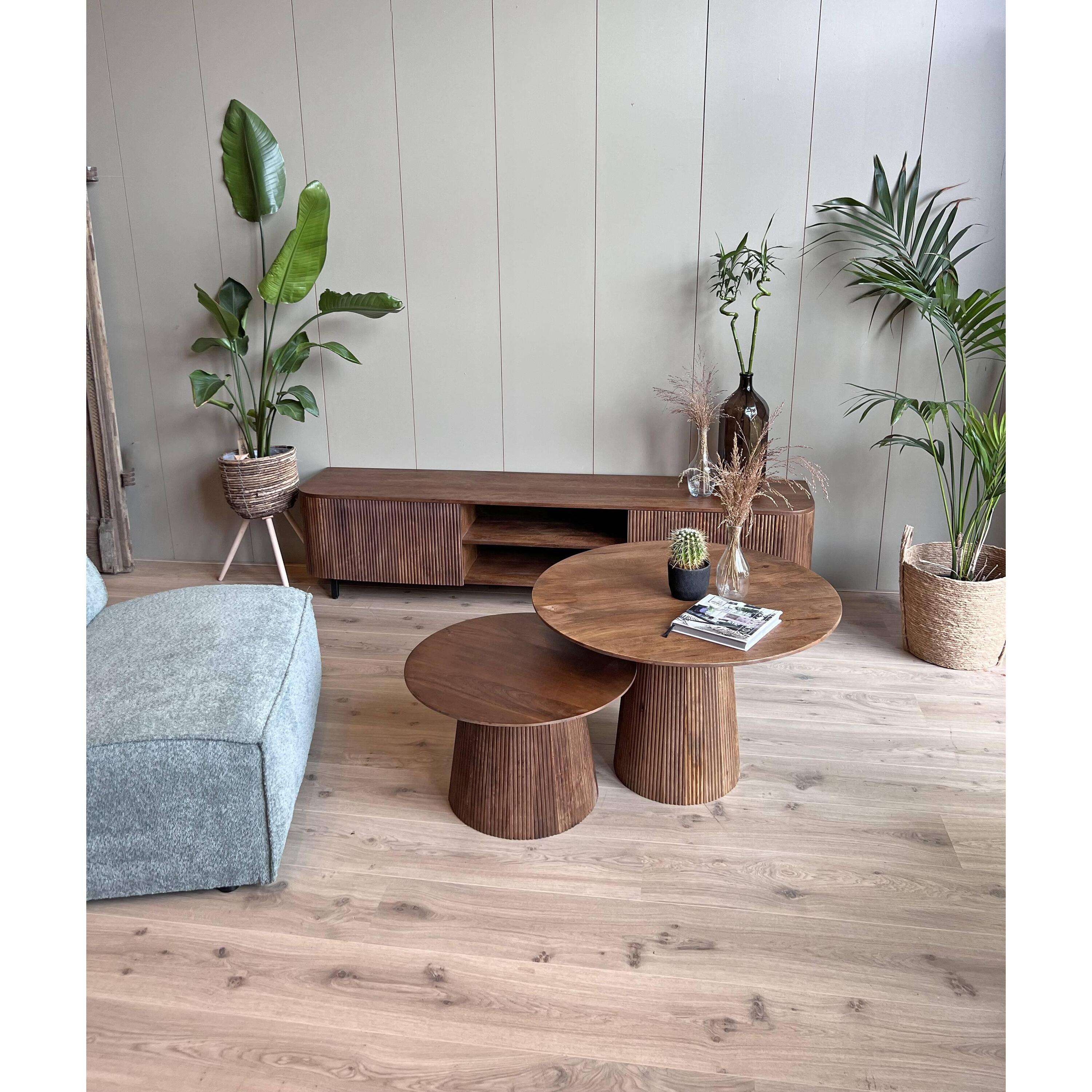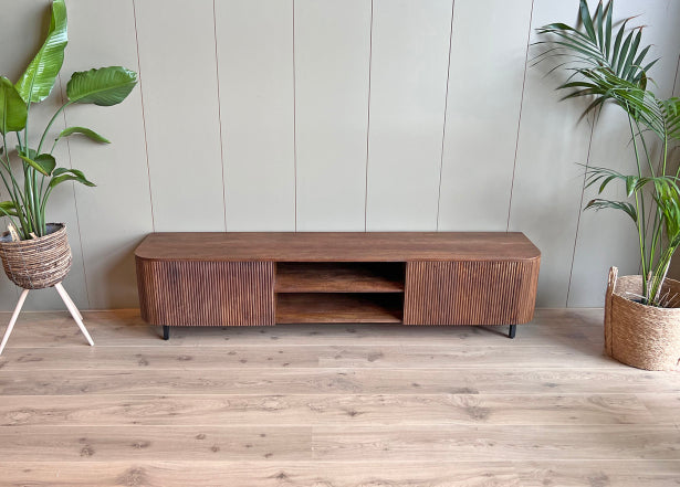 Bent u op zoek naar een TV-meubel met stijl? Kies dan voor ons televisiemeubel Rome. Deze TV-kast is gemaakt door zijn ronde vormen, de kast is gemaakt van mangohout afgewerkt met een bruine kleur. Een praktisch en stijlvol opbergmeubel voor een echte eyecatcher in uw woonkamer. Op zoek naar een bijpassende salontafel? Neem dan een kijkje bij onze hele serie Rome.