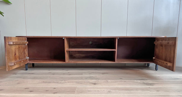 Bruin tv meubel mangohout ✓ Type: Tv-Kast ✓ Kleur kast: Bruin ✓ Materiaal kast: Mangohout ✓ Aantal kastjes: 2 ✓ Aantal lades: geen ✓ Aantal legplanken: geen ✓ BxDxH: 200x40x45