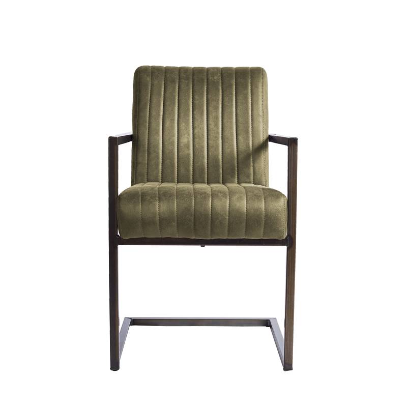De groene eetkamerstoel Texas is een moderne eetkamerstoel met armleuningen met een vintage en industrieel uiterlijk. De stoel bestaat uit in verticale lijnen gestikt lederlook gestoffeerd gedeelte. Het onderstel bestaat uit een metalen frame uit één stuk waarop het zitgedeelte is bevestigd.