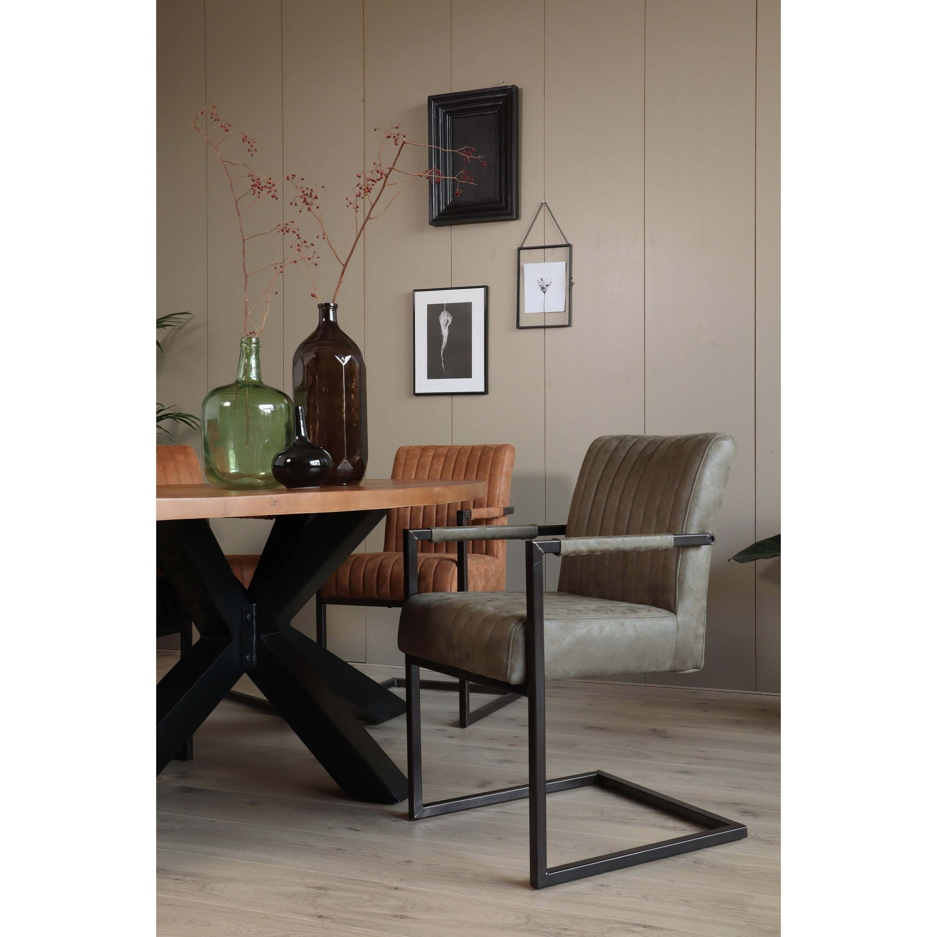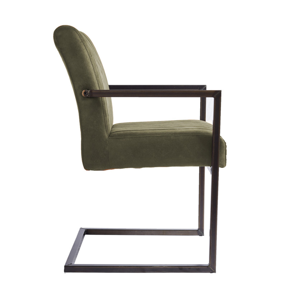 Eetkamerstoel met armleuningen groen lederlook ✓ Type: Eetkamerstoel met armleuningen ✓ Kleur: Groen (olijf) ✓ Stof zitgedeelte: 100% Polyester, Lederlook ✓ Frame: Metaal uit één stuk ✓ HxDxB: 88x61x55,5cm ✓ Zitdiepte: 43cm ✓ Zitbreedte: 45cm ✓ Zithoogte: 49cm ✓ Hoogte armleuningen: 66cm