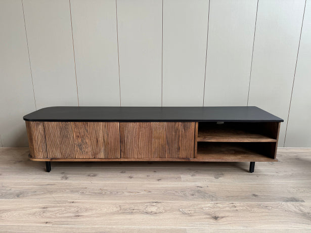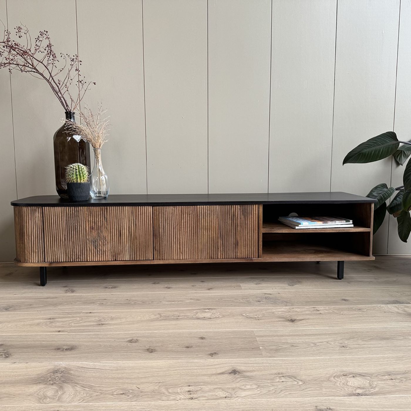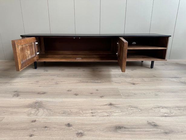 Bruin tv-meubel mangohout ✓ Type: Tv-kast ✓ Kleur kast: Bruin, zwart ✓ Materiaal kast: Mangohout, metaal ✓ Aantal kastjes: 2 ✓ Aantal lades: geen ✓ Aantal legplanken: 1 ✓ BxDxH: 180x45x40