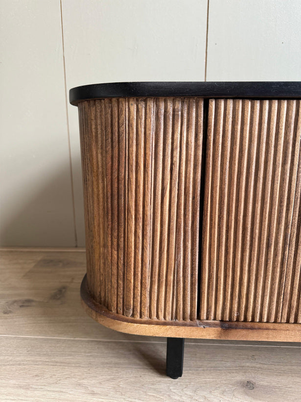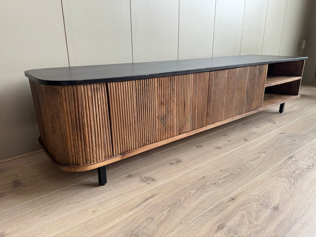 Dit prachtige Hotel chique mangohouten Tv-meubel van Old Inn Wonen is een echte toevoeging aan je interieur! Het mooie meubel van mangohout met metalen pootjes is 180cm breed, 45cm diep en 40cm hoog.