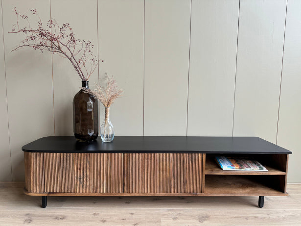 Bent u op zoek naar een Tv-meubel met stijl? Kies dan voor ons televisiemeubel Lima. Deze Tv-kast is gemaakt van mangohout afgewerkt met een bruine kleur, met een zwart afgewerkt mango houten blad. Een praktisch en stijlvol opbergmeubel voor een echte eyecatcher in uw woonkamer. Op zoek naar een bijpassende salontafel of side table? Neem dan een kijkje bij onze hele serie Lima.