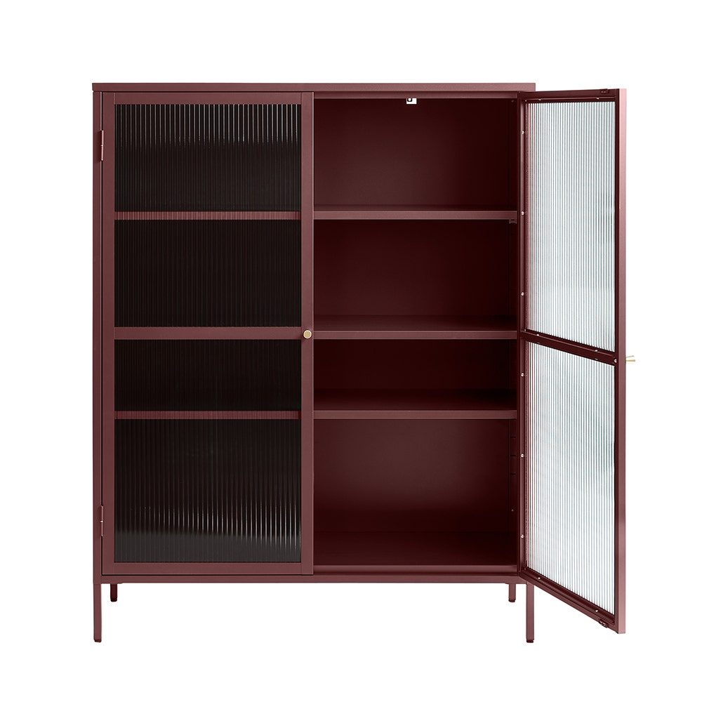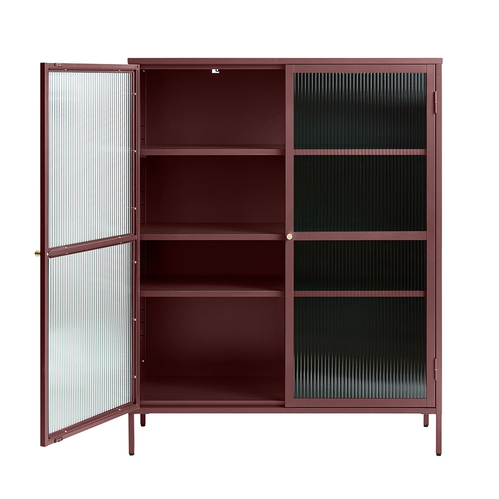 De vitrinekast is middelhoog en heeft vier planken aan de binnenzijde. De kast heeft twee deuren die zijn voorzien van geribbeld glas. In combinatie met de goudkleurige deurknoppen geeft dit de kast een trendy uitstraling. De Katja vitrinekast is de ideale keuze als je op zoek bent naar een mooie kast die extra opbergruimte biedt. Vul de planken met al je spullen en zet nog een mooie lamp of plant boven op de kast. De Katja vitrinekast is in vier kleuren beschikbaar: groen, rood, blauw en zwart.