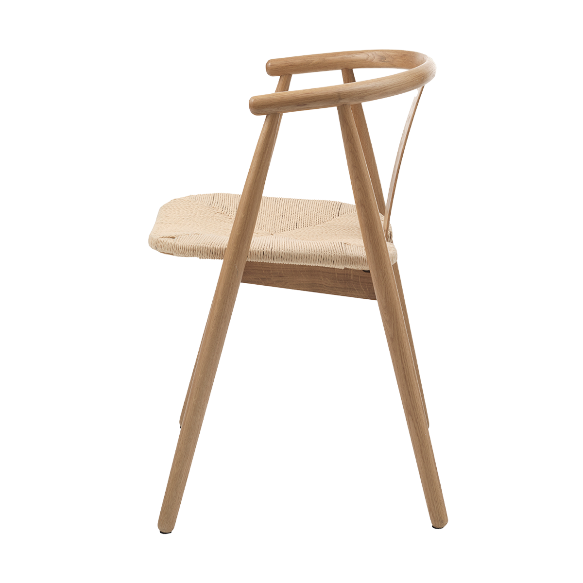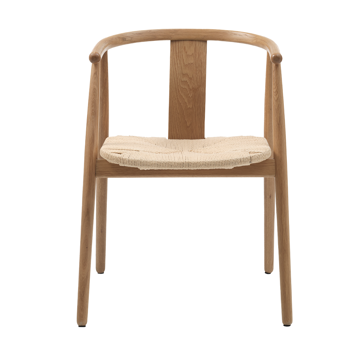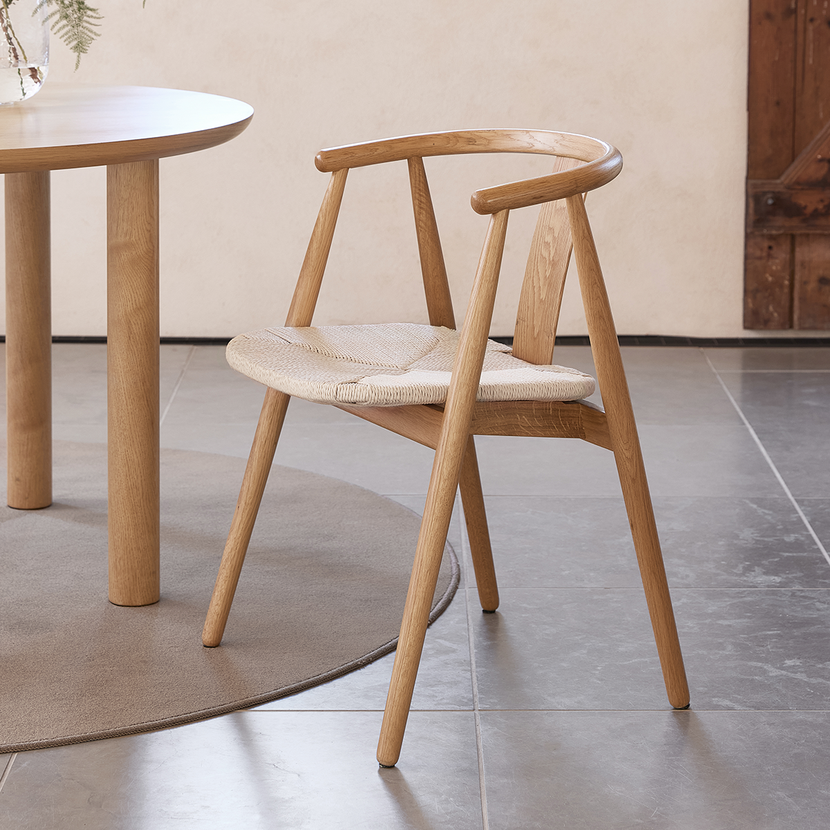 De Kenza eikenhouten eetkamerstoel van het merk Olivine is zowel stijlvol als comfortabel dankzij de armleuning en rieten ziting.