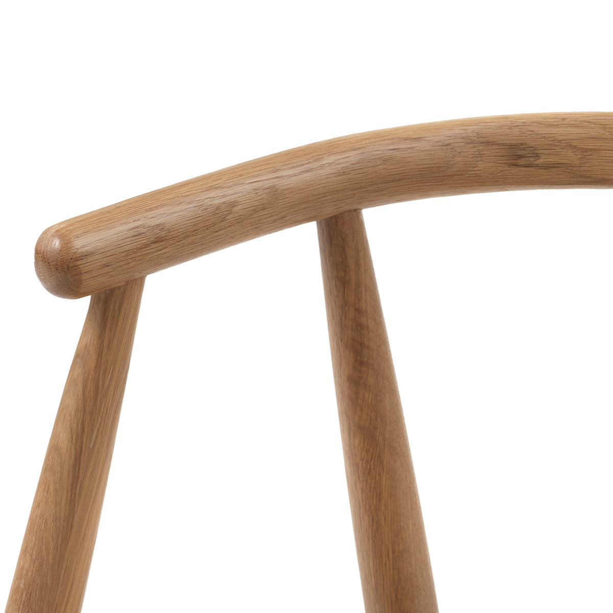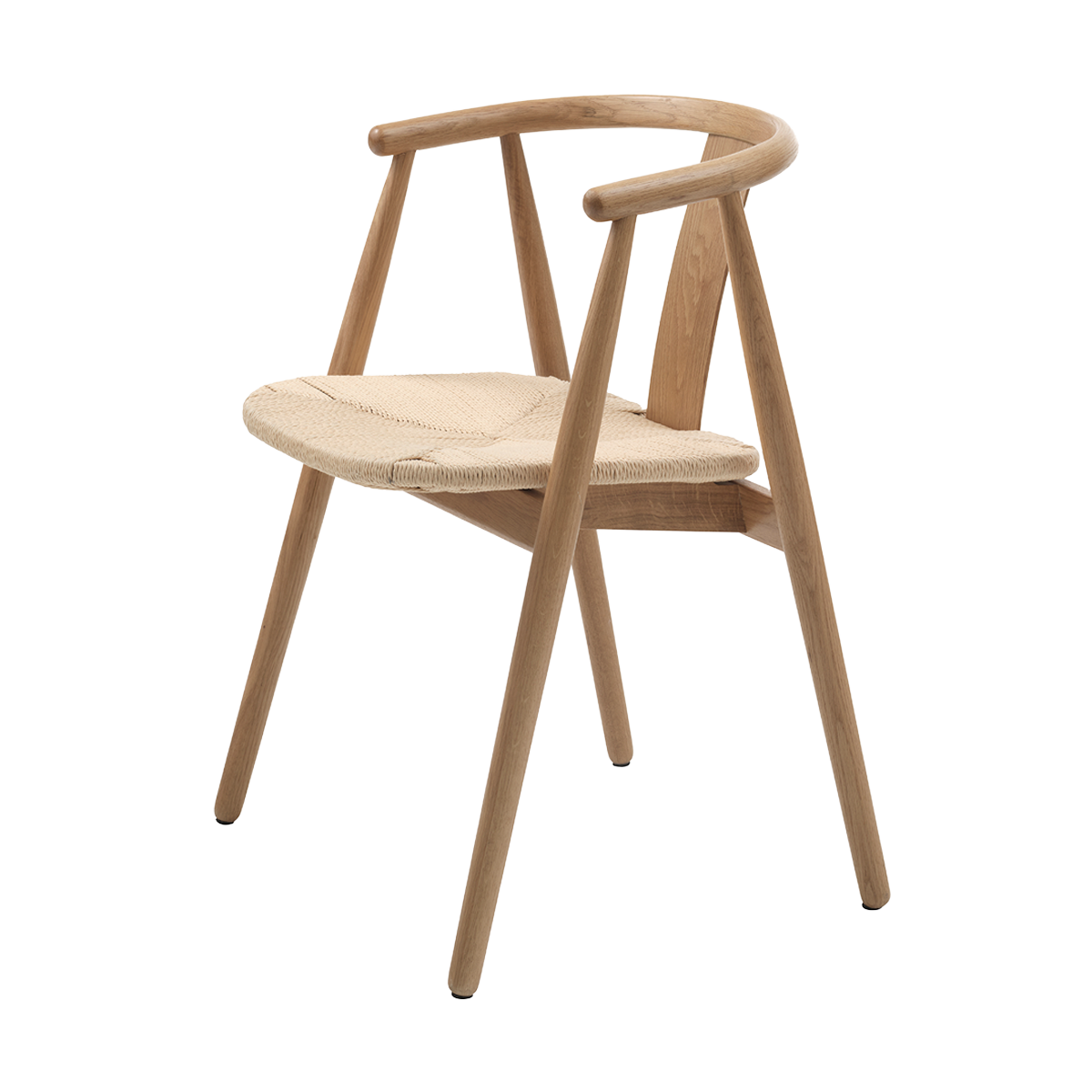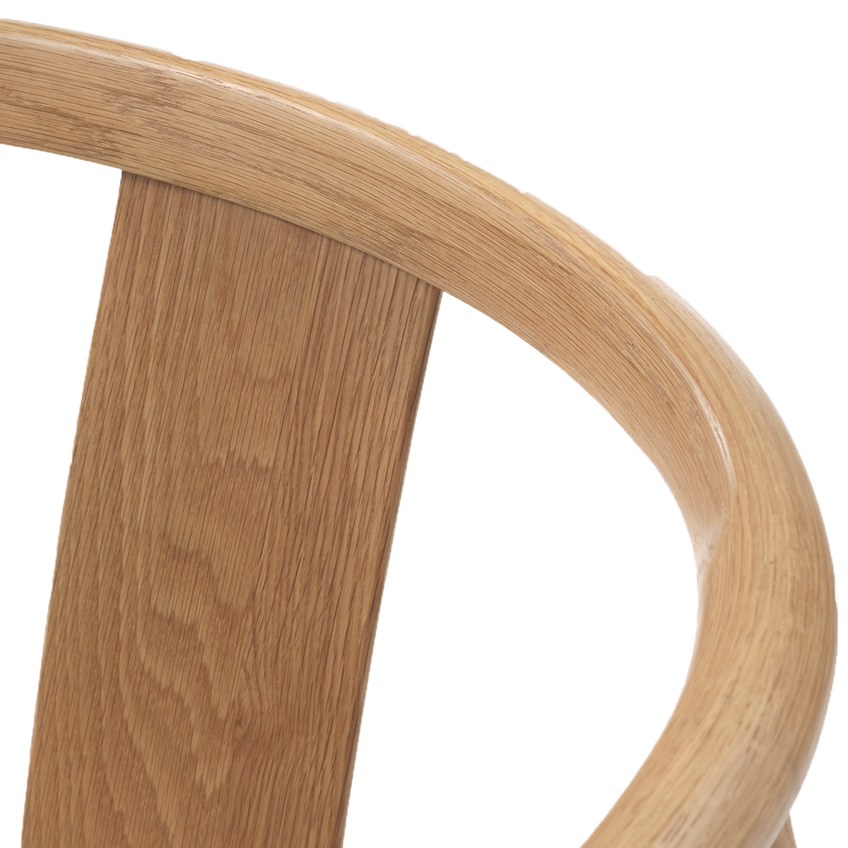 De Kenza eikenhouten eetkamerstoel van het merk Olivine is zowel stijlvol als comfortabel dankzij de armleuning en rieten ziting.
