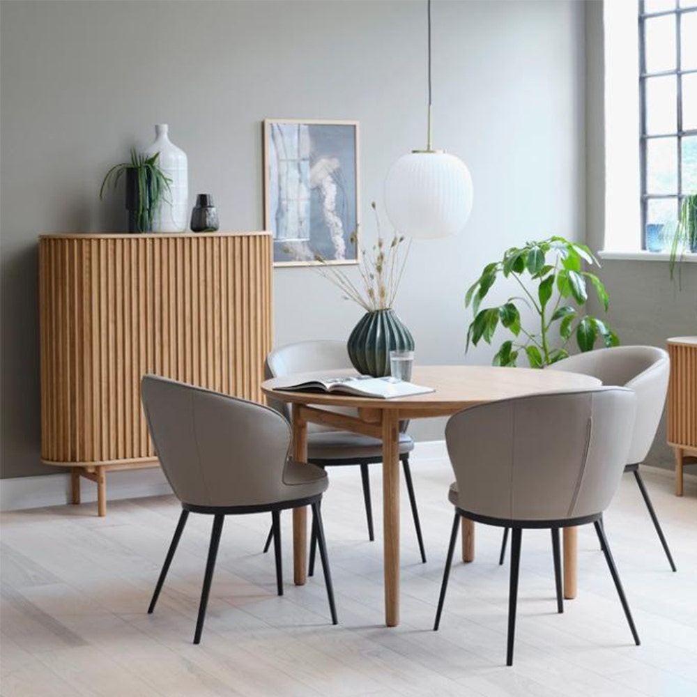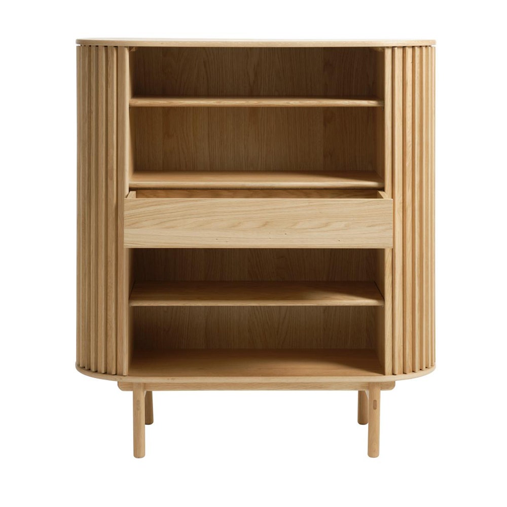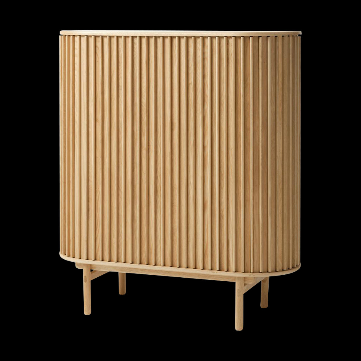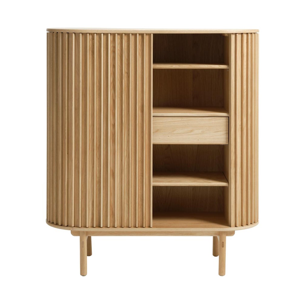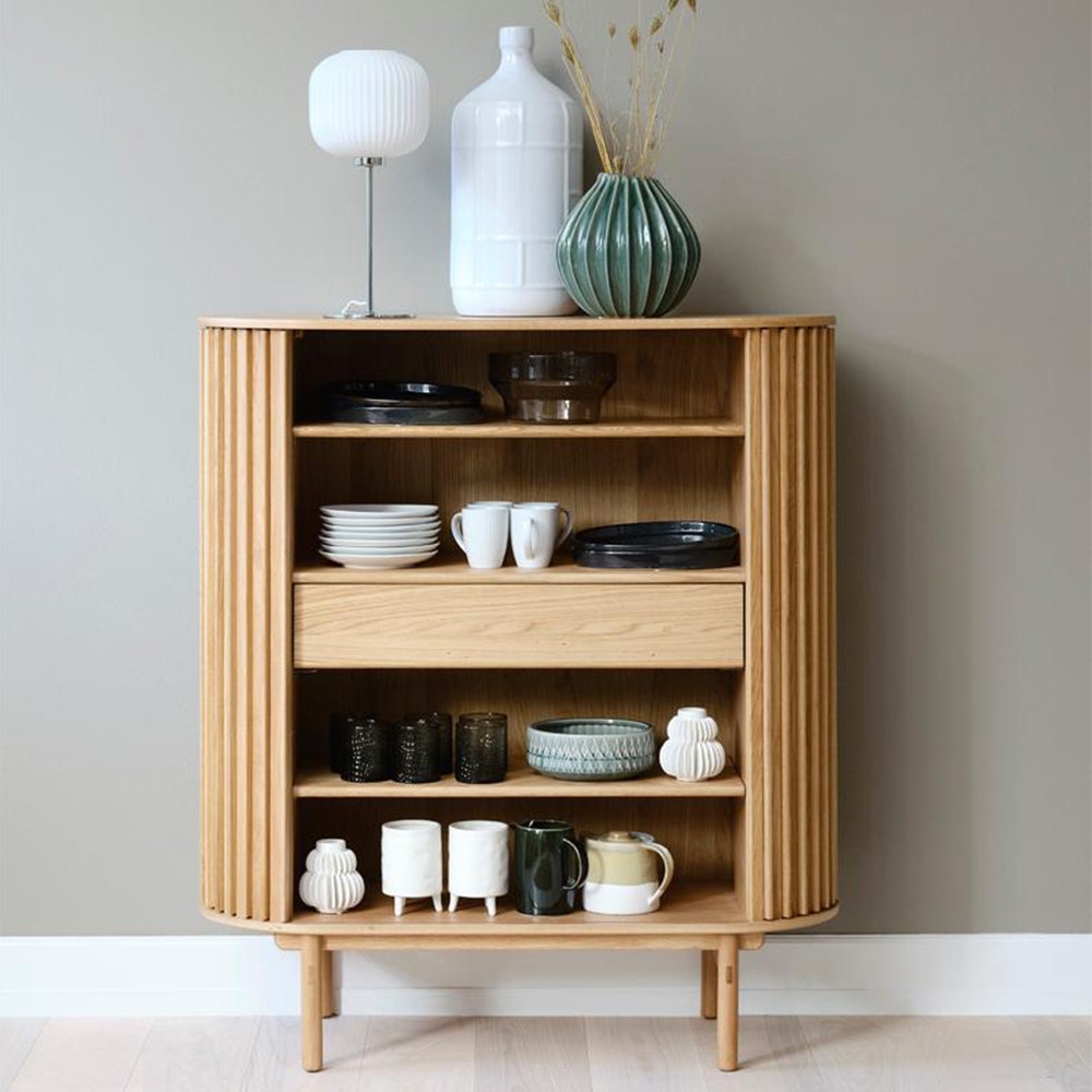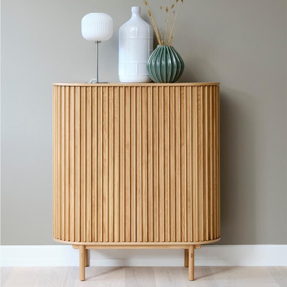 De Kjeld kast van Olivine is een houten opbergkast met ovale vorm die perfect aansluit bij een Scandinavische woonstijl.