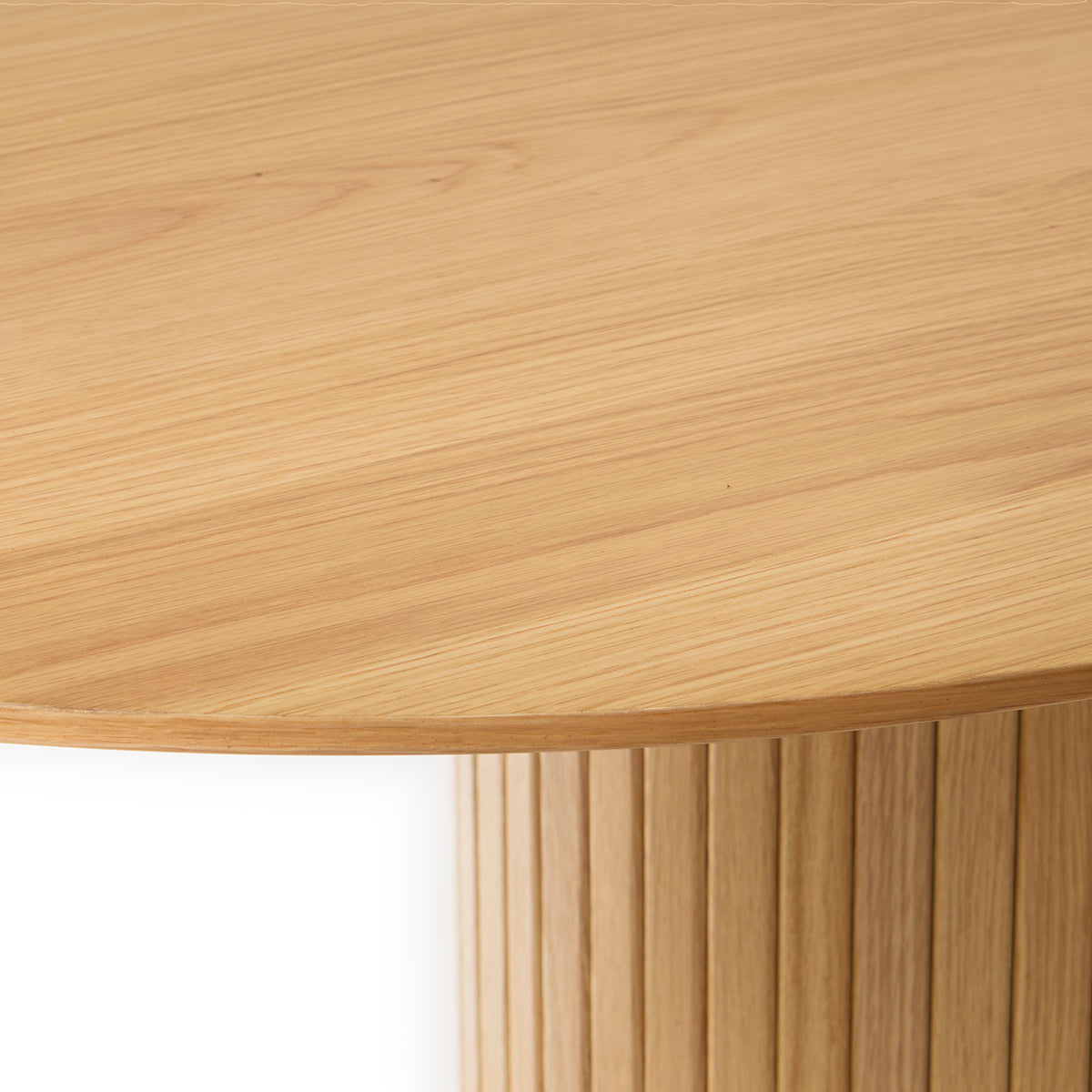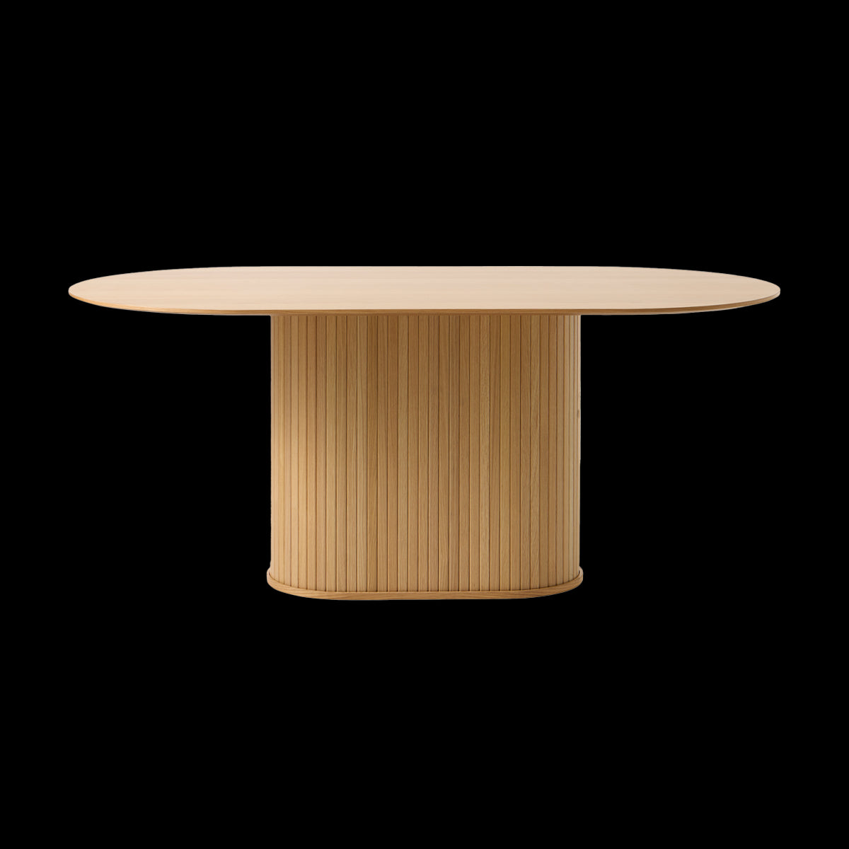 Deze eettafel combineert elegantie en functionaliteit in één bijzonder meubelstuk. Met een lengte van 180 centimeter heeft de tafel plek voor zes personen en heb je voldoende ruimte voor gezellige diners met familie en vrienden. De tafel is gemaakt van hout en is afgewerkt met een laag eikenfineer. Dankzij de ronde hoeken valt deze prachtige vorm tafel op in huis en hoef je ook niet bang te zijn voor ongelukken met scherpe hoekjes. De ovale tafelvoet is voorzien van een verticale groefstructuur, wat de tafel een moderne en trendy uitstraling geeft. Combineer deze prachtige ovale eetkamertafel met een set leuke stoelen en jouw eethoek is klaar voor gezellige etentjes! De Lenn eettafel is bovendien ook verkrijgbaar in een ronde variant. Is deze tafel helemaal jouw smaak? Kijk dan ook eens naar de andere meubels van de Lenn serie om jouw interieur compleet te maken.