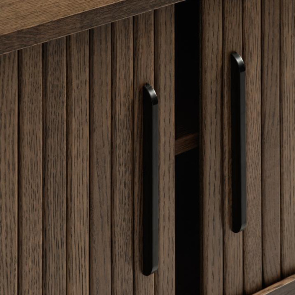 Het tv-meubel is gemaakt van hout en is afgewerkt met een laag eiken fineer. Hierdoor heeft het meubel een natuurlijke uitstraling. De poten en handvaten van de deurtjes zijn gemaakt van metaal. De kast opent zich door middel van twee schuifdeuren, waarachter zes vakken zitten om alle bijbehorende spullen van de tv te bewaren. In de onderzijde van de kast zit een uitsparing om snoeren netjes weg te werken. Door de groefstructuur in het hout valt dit tv-meubel extra op in je interieur en heeft het een moderne en trendy uitstraling.