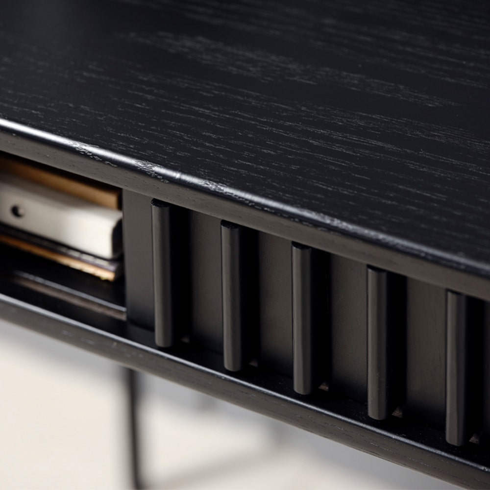 Het bureaublad is deels van massief eikenhout en deels van hout met een laag eikenfineer gemaakt. De poten zijn gemaakt van zwart metaal en zijn onderling verbonden voor extra stevigheid en een stoer detail. In het tafelblad bevindt zich opbergruimte die door middel van twee schuifdeurtjes wordt afgesloten. Hierin kan je werk- of schoolspullen opbergen zodat je het tafelblad opgeruimd houdt. De schuifdeuren zijn voorzien van verticale houten latjes, wat kenmerkend is voor alle meubels uit de Redmer serie van Olivine. De hoogte van de vloer tot aan de onderkant van het tafelblad is 63 centimeter.