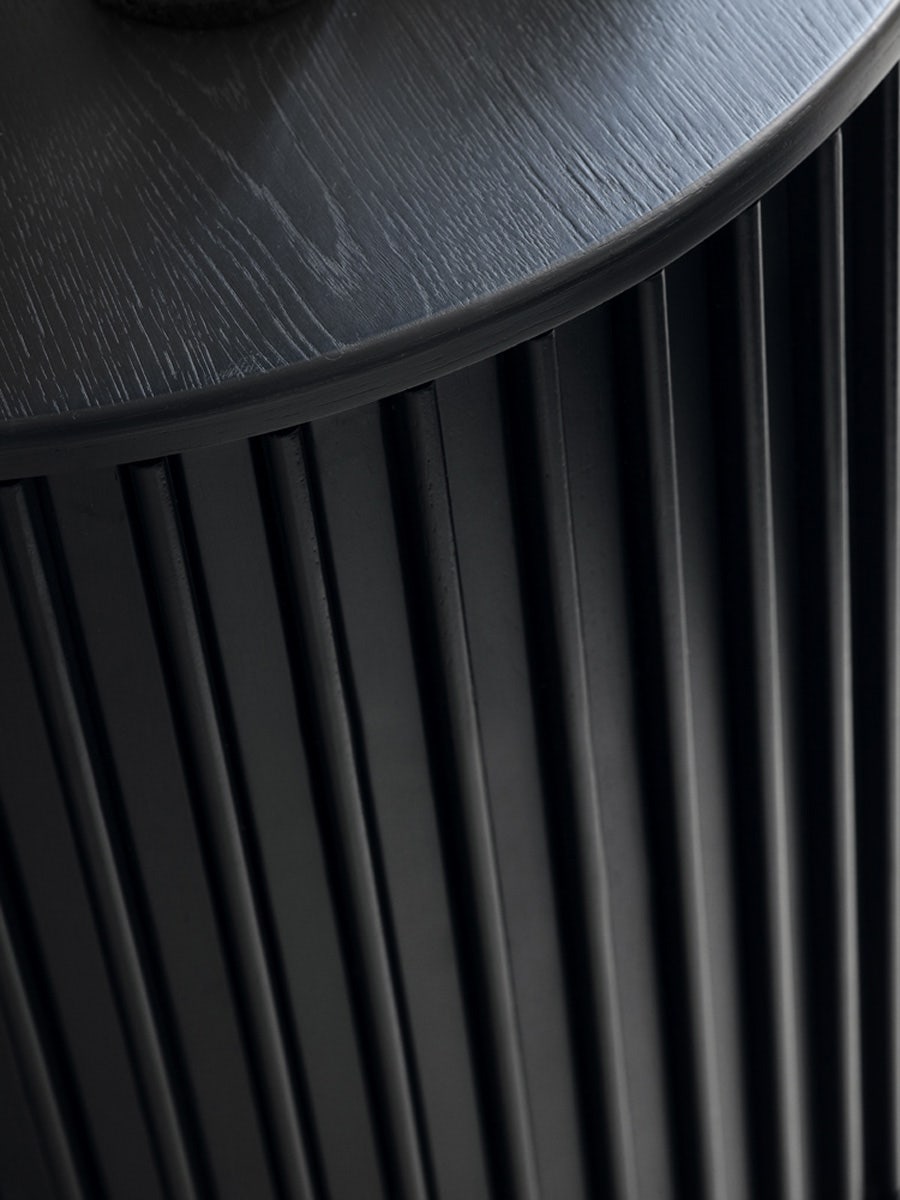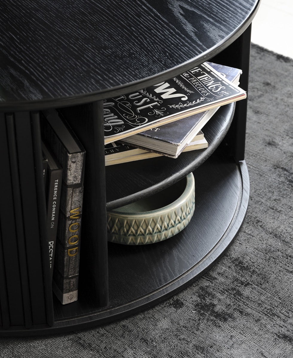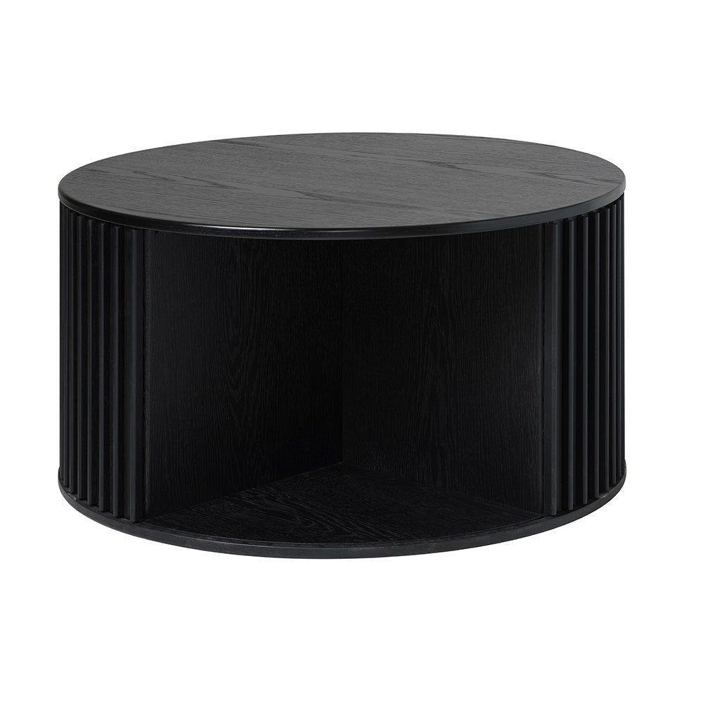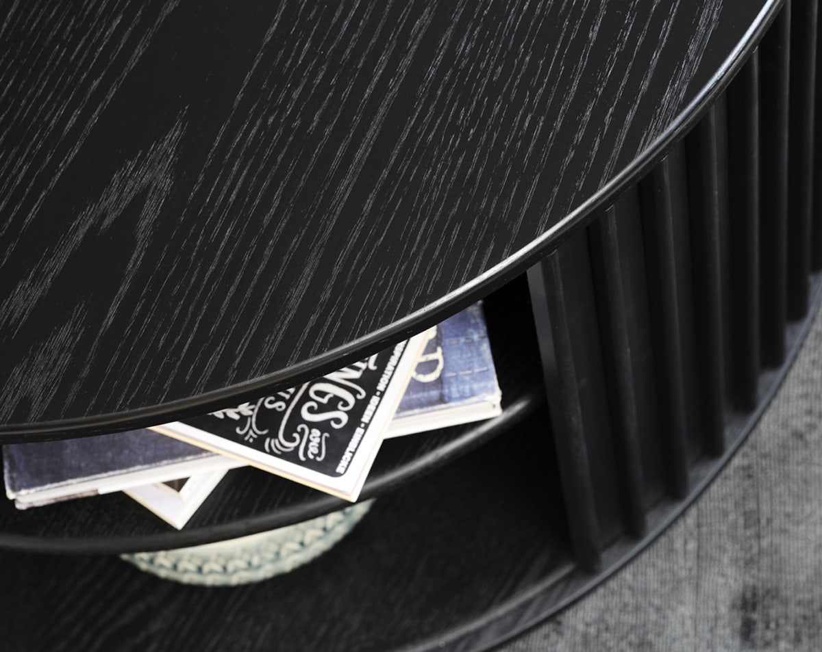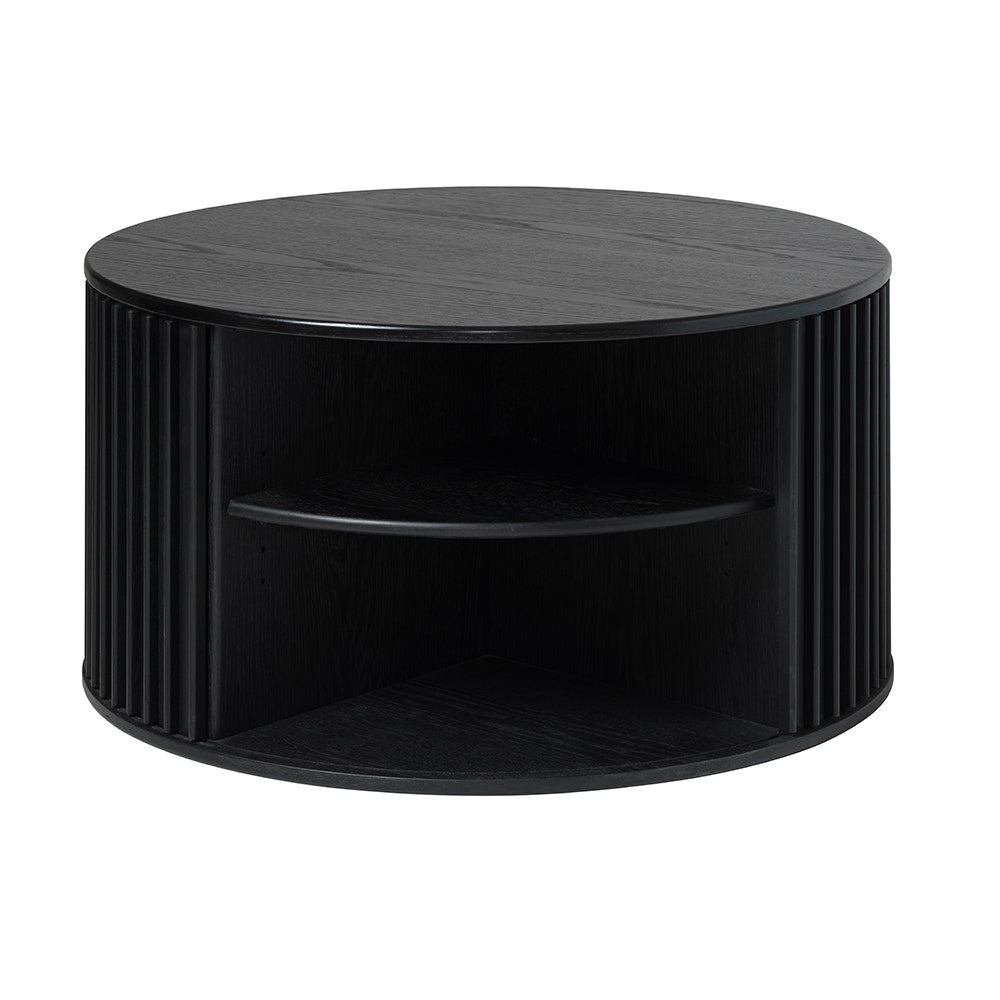 Deze ronde salontafel is deels van massief eikenhout en deels van hout met een laag eikenfineer gemaakt. De tafel is rondom bewerkt met verticale houten latjes, wat de tafel een trendy uitstraling geeft. Naast dat deze prachtige salontafel handig is om hapjes en drankjes op te zetten in de woonkamer, zit er binnenin ook nog extra opbergruimte. Zodra je de schuifdeurtjes opzijschuift, vind je drie vakken die je perfect kan gebruiken om losse spulletjes uit het zicht te houden. Heb je juist een paar mooie accessoires die je graag wil laten zien? Dan kan je de deurtjes natuurlijk ook gewoon openlaten.
