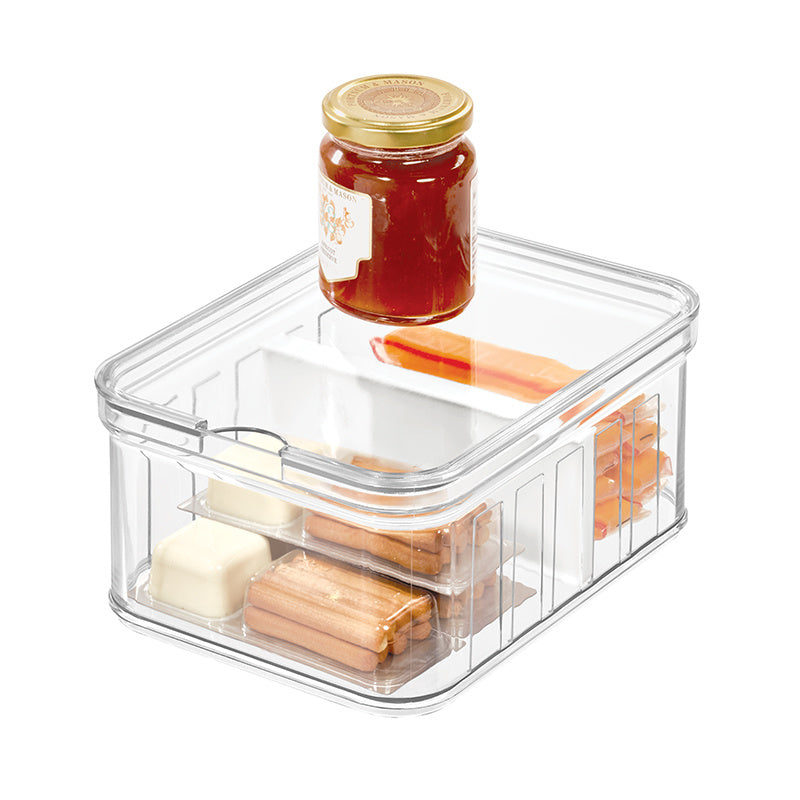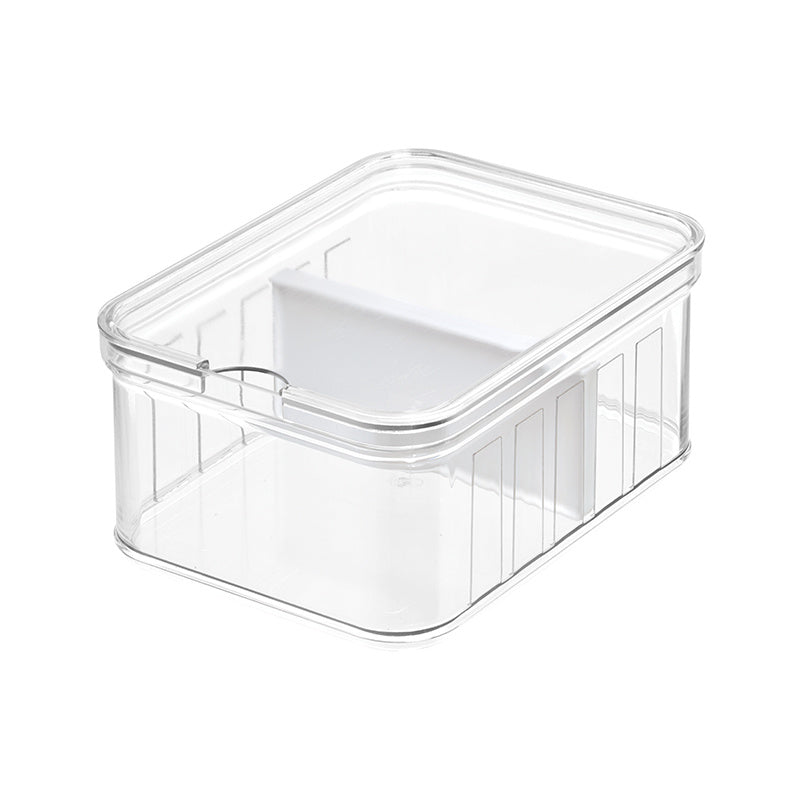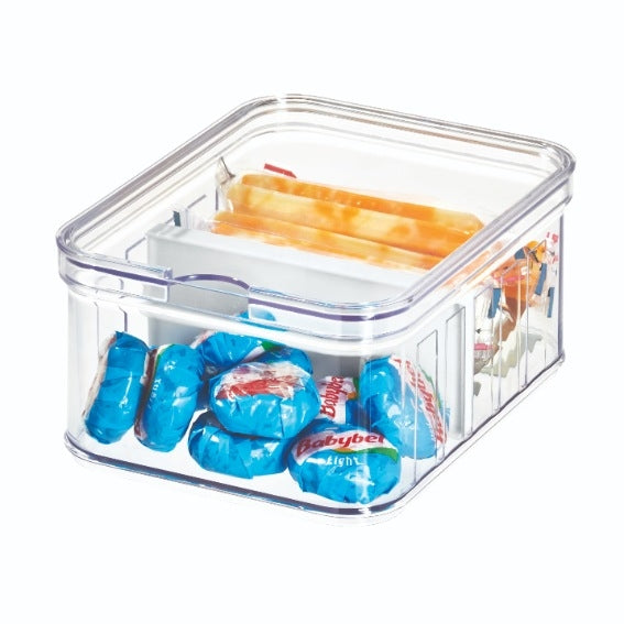 Opbergbox Koelkast met Verdeelvakken, 21.2 x 16.2 x 9.6 cm, Stapelbaar, Kunststof, Transparant - iDesign | Crisp Met deze stapelbare opbergbox koelkast met verdeelvakken uit de Crisp serie van iDesign creëer je eenvoudig al de opbergruimte die je nodig hebt in je koelkast en zorg je ervoor dat je ingrediënten extra lang vers blijven! De opbergbox is gemaakt van kunststof waardoor deze eenvoudig schoon te maken is met een vochtige doek en heeft een afmeting van 21.2 x 16.2 x 9.6 centimeter. Door de handige handgrepen die de opbergbox bevat is deze gemakkelijk in en uit de koelkast te halen. De opbergbox koelkast heeft drie verdeelvakken waarmee je eenvoudig je ingrediënten zoals groentes of fruit van elkaar kunt scheiden. Combineer deze opbergbox koelkast met verdeelvakken met de andere handige koelkast organizers uit de Crisp serie van iDesign voor een altijd opgeruimde en georganiseerde koelkast! Pluspunten:
