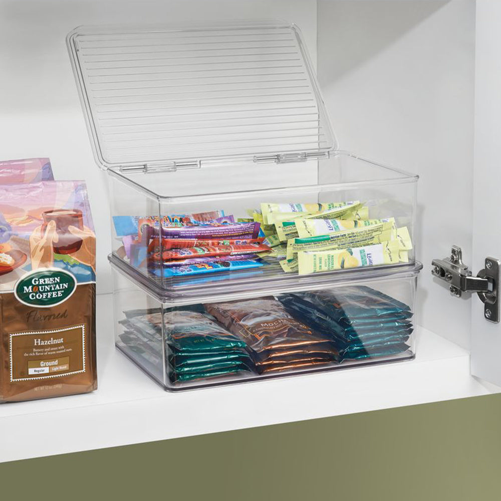 Opbergbox met Deksel, 34.3 x 14.6 x 12.7 cm, Stapelbaar, Kunststof, Transparant - iDesign | Kitchen Binz Met deze handige én multifunctionele opbergbox met deksel uit de Kitchen Binz serie van iDesign is het opruimen en organiseren van je keuken, kledingkast of andere ruimte nog nooit zo eenvoudig geweest. De opbergbox is gemaakt van kunststof en heeft een afmeting van 34.3 x 14.6 x 12.7 centimeter. De opbergbox kan eenvoudig afgesloten worden met de deksel, deze zorgt er ook nog eens voor dat de opbergbox stapelbaar is en je dus al je spulletjes eenvoudig op kunt bergen! Door het transparante materiaal van de opbergbox past deze in iedere gewenste ruimte. Combineer deze opbergbox met deksel met de andere handige opbergartikelen uit de Kitchen Binz serie van iDesign voor een altijd georganiseerde en opgeruimde setting in iedere gewenste ruimte! Pluspunten: