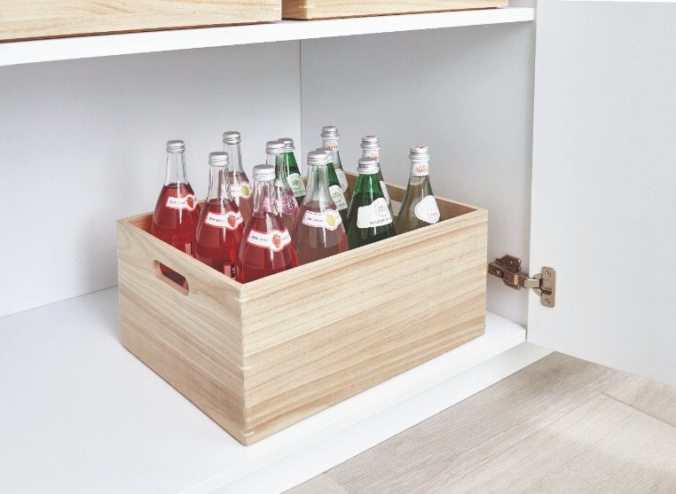 Met de The Home Edit opbergbox met handgrepen van iDesign wordt het organiseren van de voorraadkast gecombineerd met de duurzaamheid van Paulownia hout. Dit hout wordt verkregen op een verantwoorde manier en staat bekend als het snelst groeiende hardhout ter wereld. Ondanks de duurzaamheid is het hout verrassend licht in gewicht. Hét perfecte materiaal voor deze opbergbox aangezien dit het verplaatsen extra makkelijk maakt. De rechte wanden zorgen ervoor dat de ruimte op de plank optimaal kan worden benut terwijl de handgrepen ervoor zorgen dat de inhoud van de opbergbox makkelijk te bereiken is. Verder is de opbergbox bestand tegen kromtrekken en kan hij dan eenvoudig worden schoongemaakt met een vochtige doek. De opbergbox heeft een afmeting van 38 x 46 x 30.5 cm en is ook verkrijgbaar in het zwart.