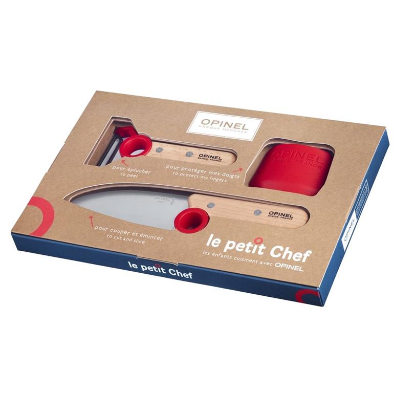 Opinel Le Petit Chef De Le Petit Chef serie is speciaal ontworpen voor de allerkleinste koks. Ze kunnen aan de slag met échte messen en daarmee de juiste technieken leren, maar wel op een veilige manier. De kunststof ring zorgt voor een goede grip en maakt het snijden makkelijker. Het houten handvat is comfortabel en ligt zacht in de hand. De Opinel Le Petit Chef serie bestaat uit een mes, een vingerbeschermer en een dunsnijder. Opinel mes en vingerbeschermer Het mes heeft een 12C27 roestvrij Sandvikstaal afgerond lemmet van tien centimeter lang en een dikte van 1,7 millimeter. Het handvat is van beukenhout en is gelakt met vernis. Dit robuuste mes voor kinderen is ideaal voor hakken en snijden. De vingerbescherming heeft een afmeting van 6,5 bij 5,5 centimeter en maakt het snijden extra veilig. Het mes is wel scherp, dus een oogje in het zeil houden blijft verstandig!
