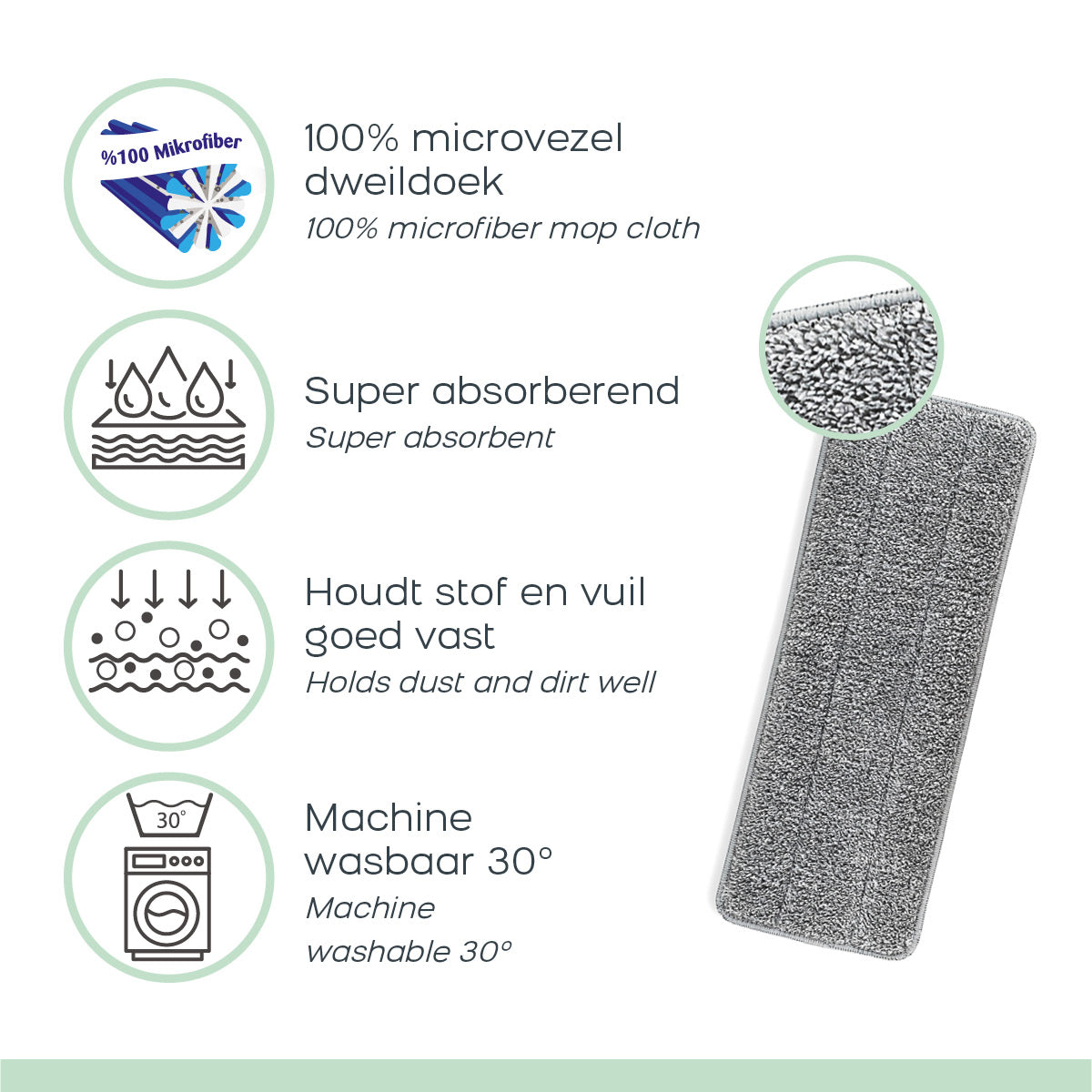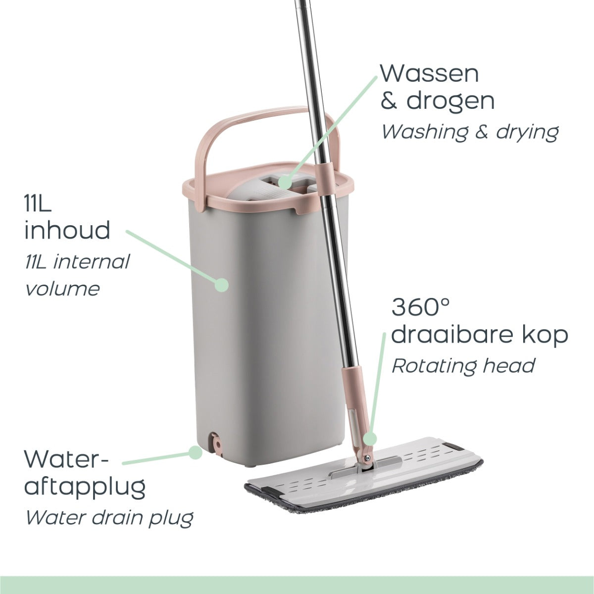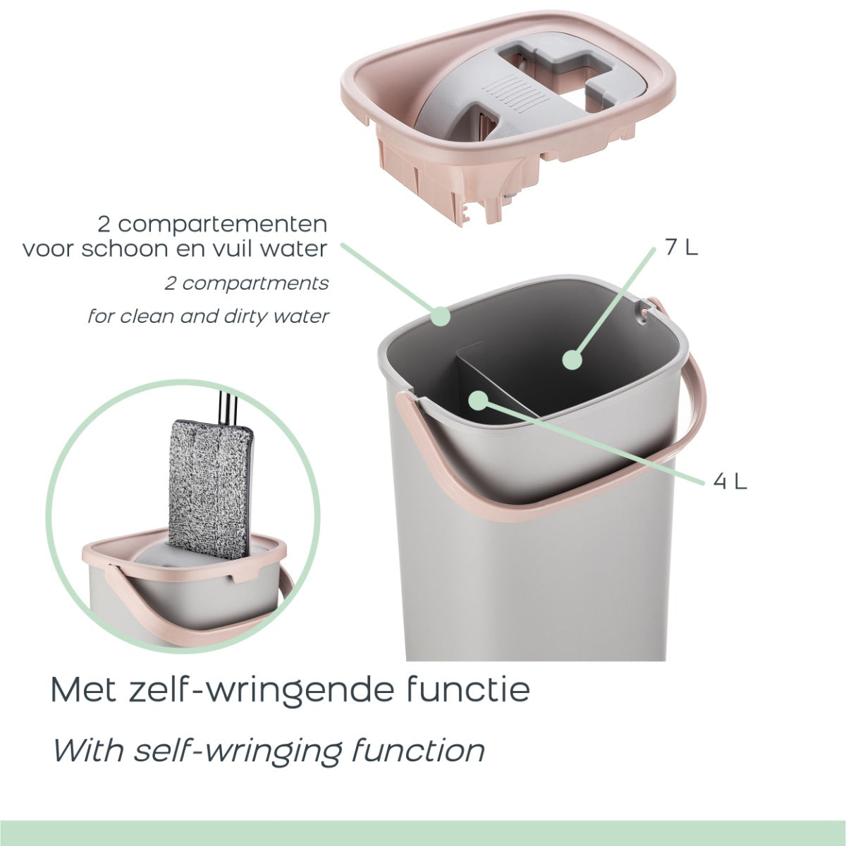 Dit mopsysteem bestaat uit een speciale emmer met twee aparte kamers. Een voor het schone water en een voor het vuile water. Dankzij het ingenieuze wring- en zelfreinigende opzetstuk van de emmer is de dweildoek altijd schoon en droog om opnieuw in het schoonmaakwater te doen. Met de ene kant maak je de mop klaar voor het schoonmaken, met de andere kant wring je hem uit waardoor vuil en overtollig water in de emmer achterblijven. Dit elimineert de noodzaak om vuil water aan te raken of een natte dweil uit te wringen, wat zorgt voor een hygiënische en rommelvrije schoonmaakervaring. Bovendien is bukken om de mop uit te wringen niet meer nodig! Vloerwisser met 360° kop en 100% microvezel doek