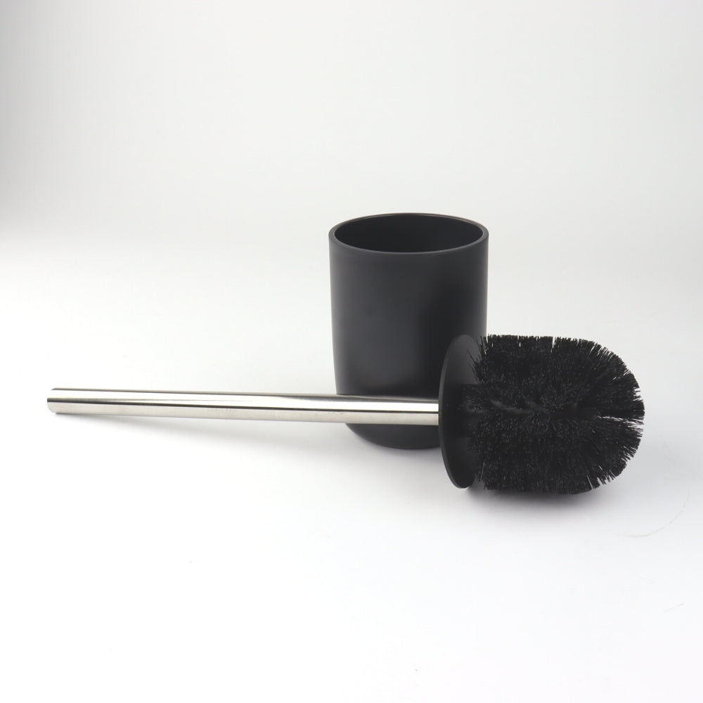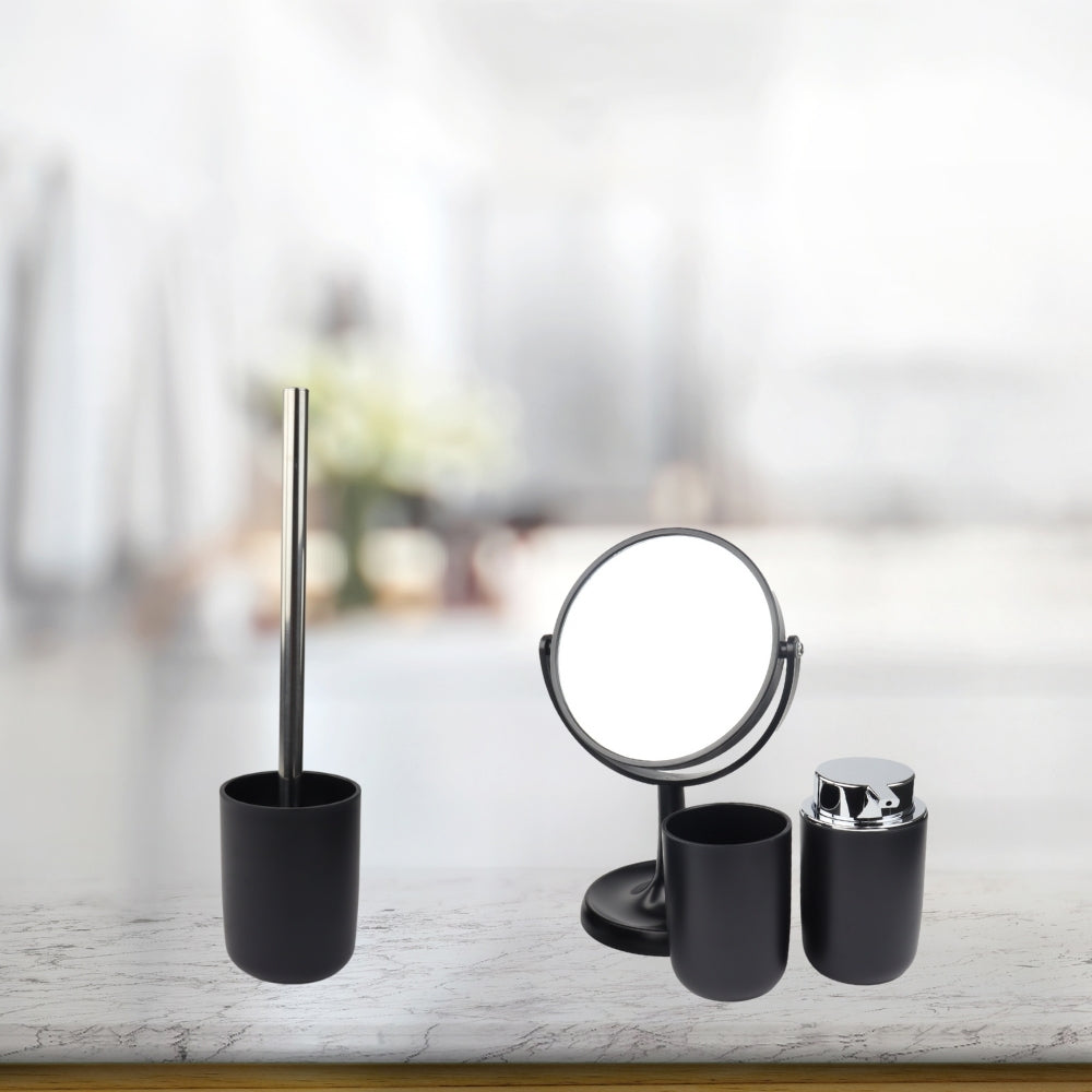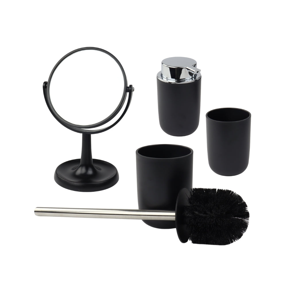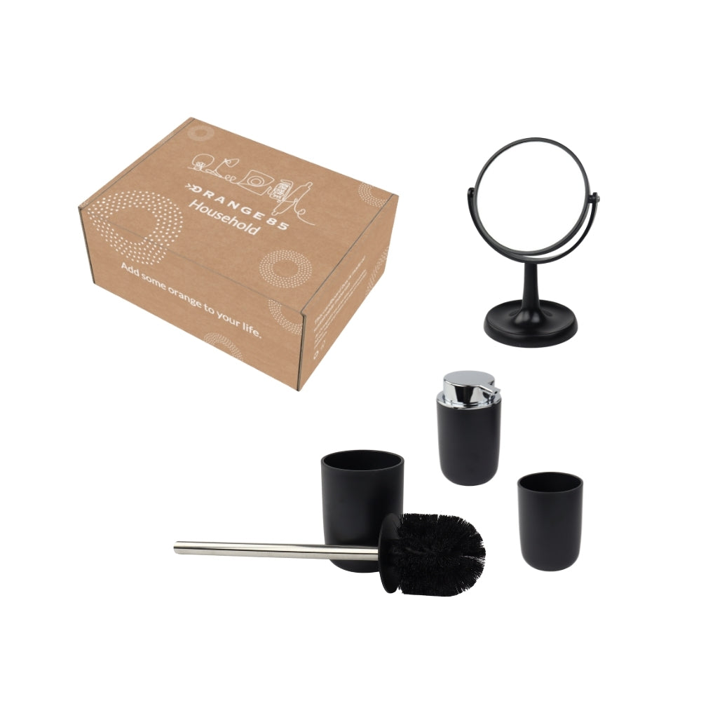 Deze Orange85 badkamerset bestaat uit 4 badkamer accessoires. Deze producten zijn gemaakt in dezelfde stijl. Deze set bevat alles wat nodig is in de badkamer. De set bestaat uit een wc borstel, een spiegel, een zeeppomp en een beker die te gebruiken is als tandenborstelhouder. De wc borstel met houder heeft een diameter van 8.8 cm en een hoogte van 36 cm. De zeeppomp heeft een diameter van 9 cm en een hoogte van 12 cm. De beker heeft een diameter van 9 cm en een hoogte van 10 cm. Alle producten hebben een mat zwarte afwerking.