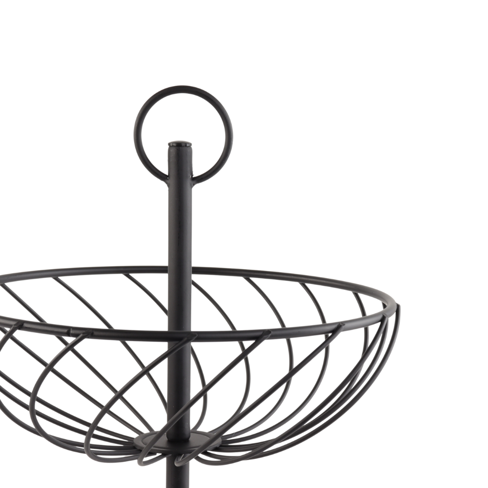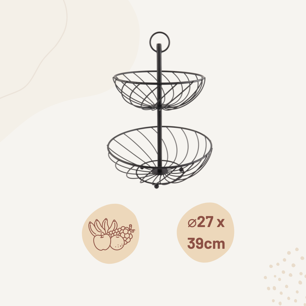 De fruitmand etagère van Orange85 is voorzien van 2 manden. De etagère is geschikt om veel fruit in om te bergen. Het materiaal van de fruitschaal is metaal en de kleur is zwart. De bovenste mand heeft een diameter van 22cm en de onderste een diameter van 27cm. De hoogte van de fruitmand etagère is 39 cm.