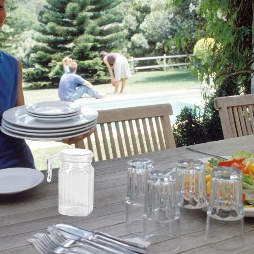 Ben je op zoek naar een glazen karaf? Deze glazen karaffen hebben een mooi design en zijn handig in gebruik. De karaf is gemaakt van stevig glas en schenkt gemakkelijk. Ook heeft het een handige deksel waarmee je de inhoud beschermt tegen vliegen en andere ongedierte. De karaf heeft een inhoud van ongeveer 0,5 liter. Dit is geschikt om een klein groepjes mensen te voorzien van water met munt, of bijvoorbeeld versgeperste jus d'orange. De karaf is een set van 2. Zo kun je meerdere karaffen op tafel zetten waar iedereen bij kan.