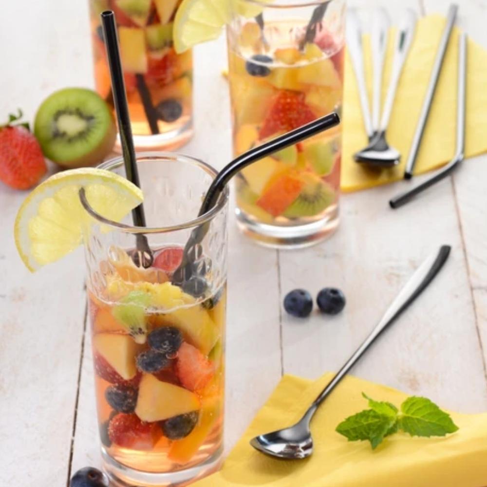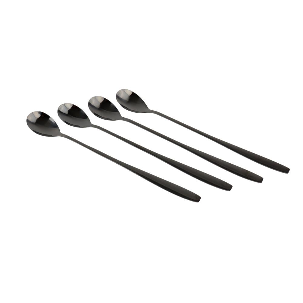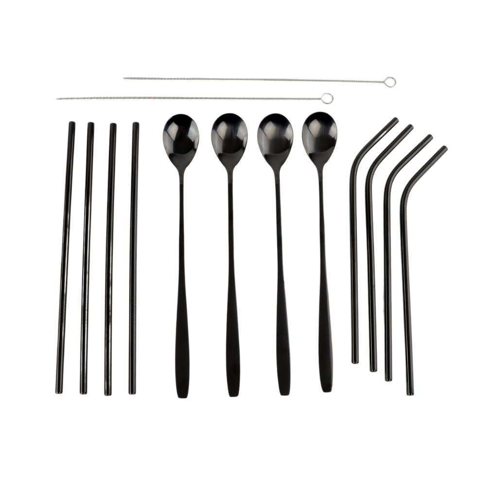 Orange85 ijzeren rietjes en lange koffielepels. Deze set bestaat uit 4 lange koffielepels, 8 rietjes en 2 reinigers voor de rietjes en is in totaal 14-delig. Het materiaal van de set is ijzer. De lepels en rietjes zijn zwart. De set is vaatwasser bestendig