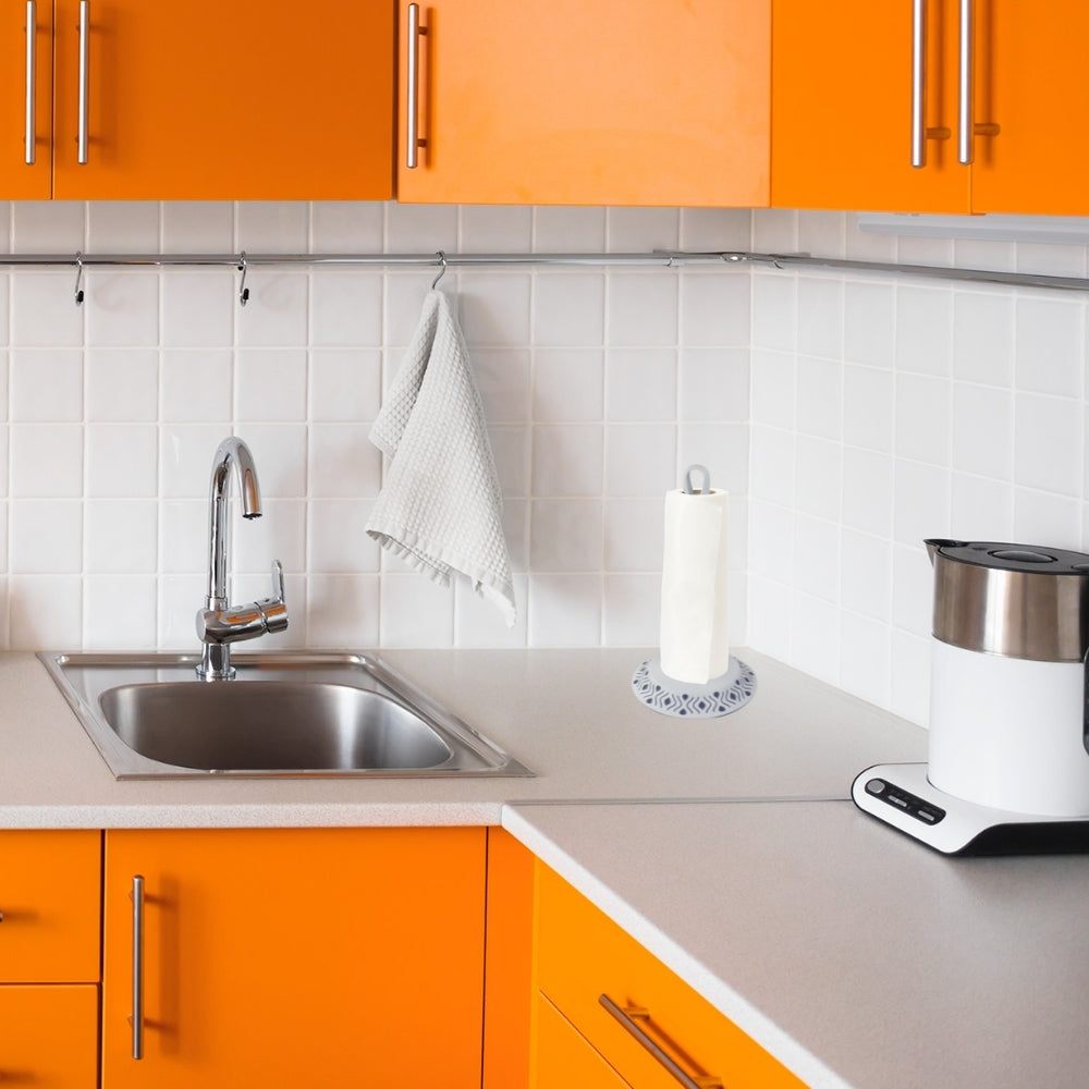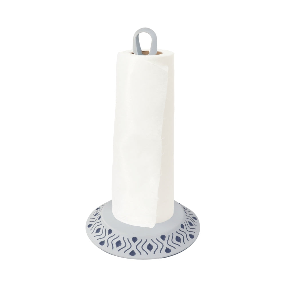 Deze Orange85 keukenrolhouder heeft een sierlijk patroon. De houder is wit met aan de voet een blauw patroon. De houder is geschikt voor elke keukenrol. Aan de bovenkant zit een handgreep waaraan de houder eenvoudig op te tillen is. Doordat de houder gemaakt is van kunststof is de houder goed schoon te maken.