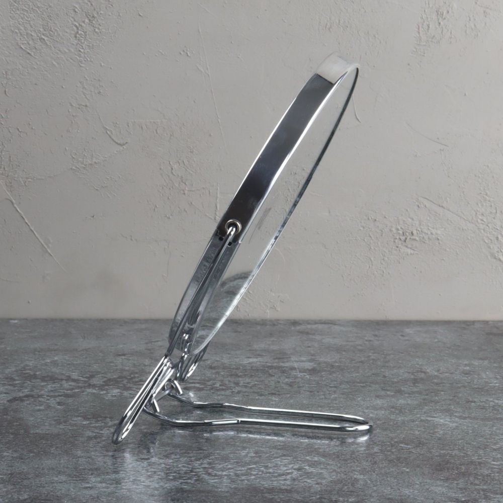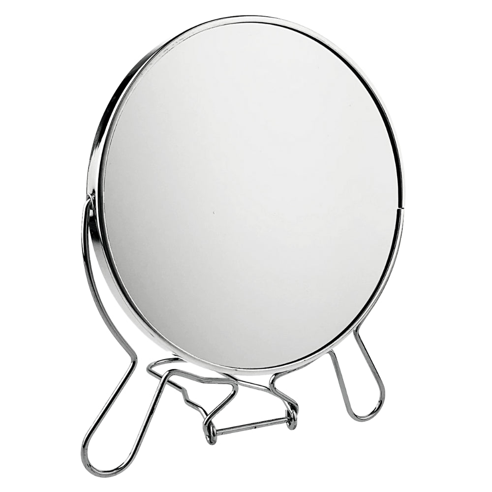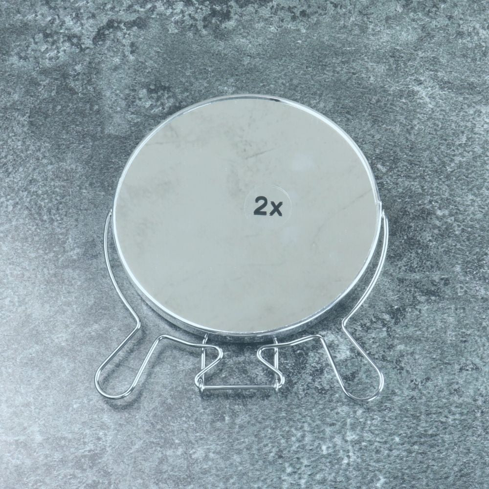 Make up spiegel op standaard van het merk Orange85. De spiegel heeft een diameter van 16,5 cm en heeft aan beide zijdes een spiegel. Eén spiegel is op ware grootte, en de andere heeft een vergroting van x2. Je kunt de spiegel samen met het standaard eenvoudig inklappen waardoor deze handig is om mee te nemen op reis.