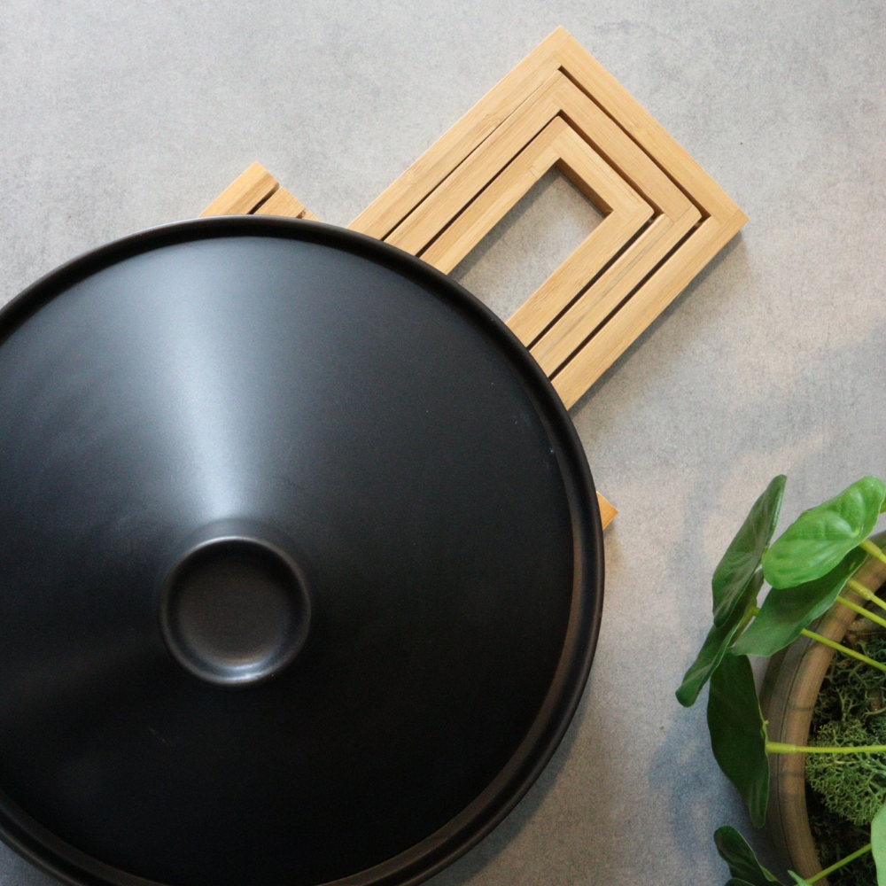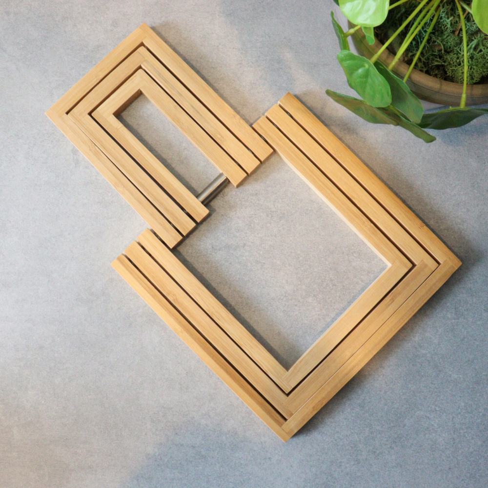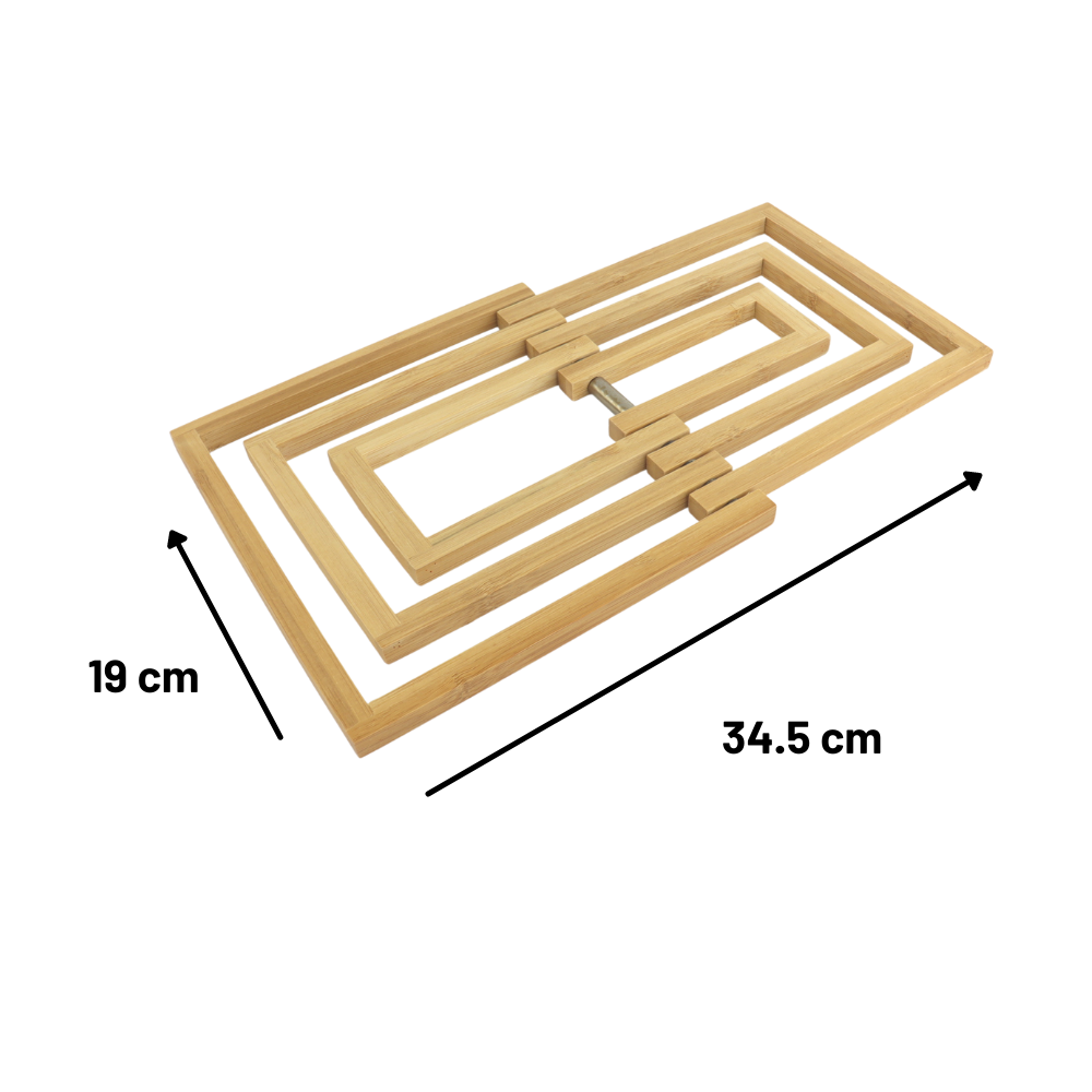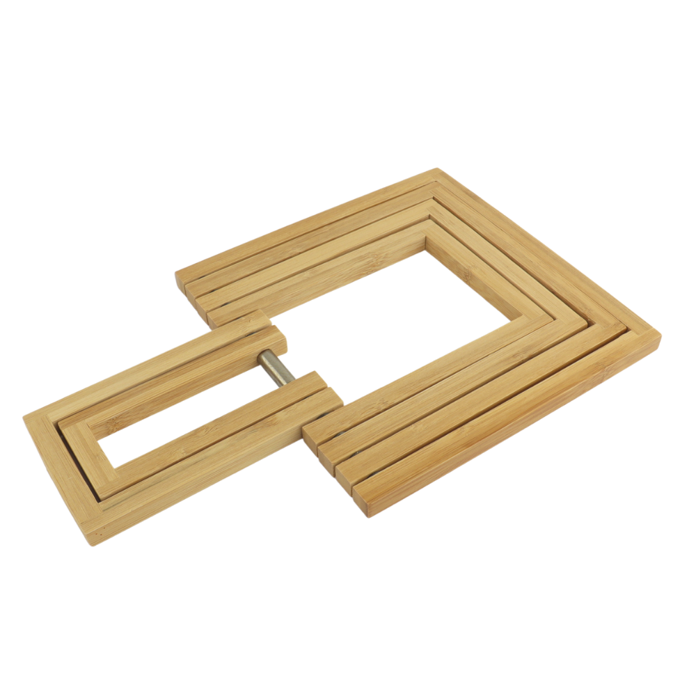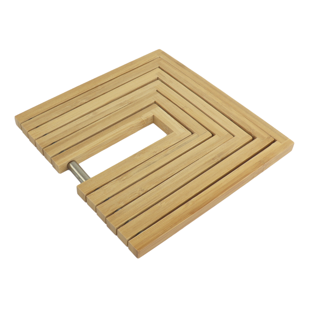 Deze onderzetter van Orange85 is te gebruiken in twee maten. Ingeklapt is de onderzetter 19 bij 19 cm en geschikt voor een enkele pan. Uitgeklapt passen er twee pannen op. De onderzetter is dan 34,5 bij 19 cm. Het materiaal is bamboe. Dit zorgt er voor dat de onderzetter snel afkoelt na gebruik. De onderzetter is niet geschikt voor in de vaatwasser.