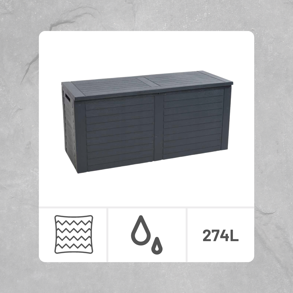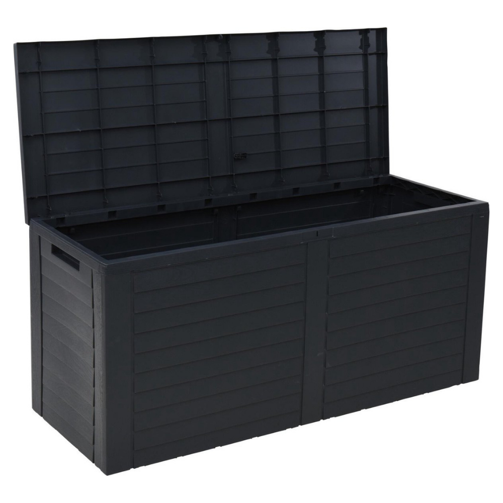 De Opbergbox van Orange85. Ideaal voor het opbergen van spullen. Zeker te gebruiken buiten als tuinkussenbox. De tuinbox is zwart van kleur en gemaakt van Kunststof. De afmetingen van de box zijn: 115x45x53 cm.