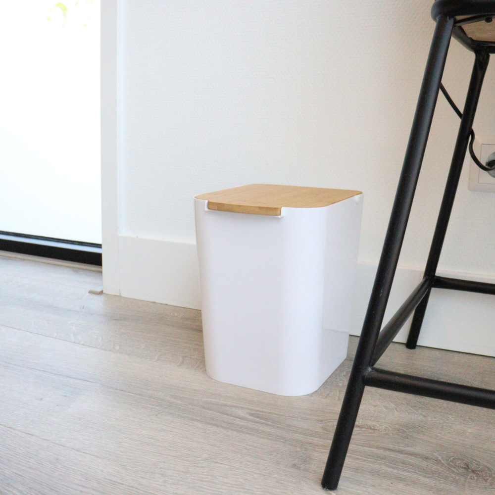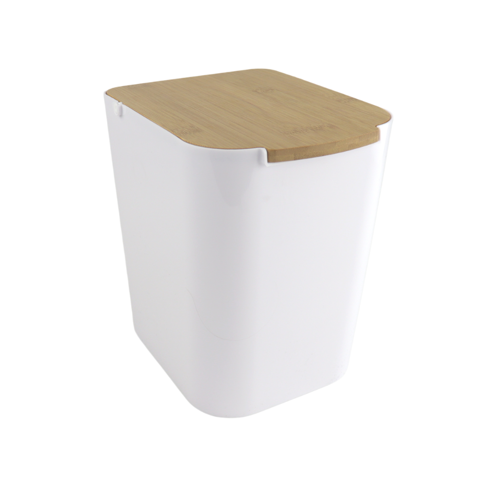 De prullenbak van Orange85 heeft 5 L aan inhoud. Geschikt voor het weggooien van klein afval. Hiernaast ook makkelijk te verschuiven en op te bergen door het kleine formaat. De prullenbak is gemaakt van kunststof en heeft een deksel van bamboe.