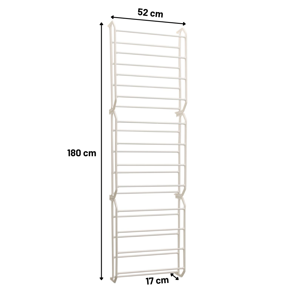 Met het schoenenrek van Orange85 heeft u geen losliggende schoenen meer in de hal liggen. Dit schoenenrek kunt u ophangen aan uw deur, en hier kunnen zo een 36 paar in! Het product is van kunststof en metaal gemaakt. De afmetingen zijn 52x17x180 cm.