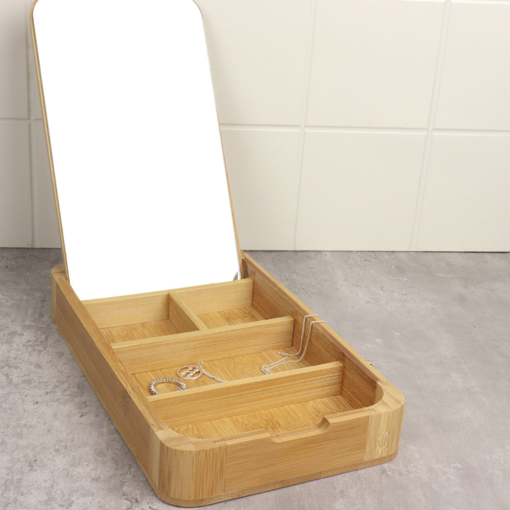 Deze sieradendoos van Orange85 is door zijn compacte formaat eenvoudig mee te nemen. Het doosje bestaat uit vijf vakjes van verschillende groottes. De deksel die erop zit is eraf te halen door aan het greepje te trekken. Aan de binnenkant van de deksel zit een spiegel. Deze spiegel is los te gebruiken of neer te zetten in het doosje. Zo heb je je handen vrij tijdens het gebruik ervan.