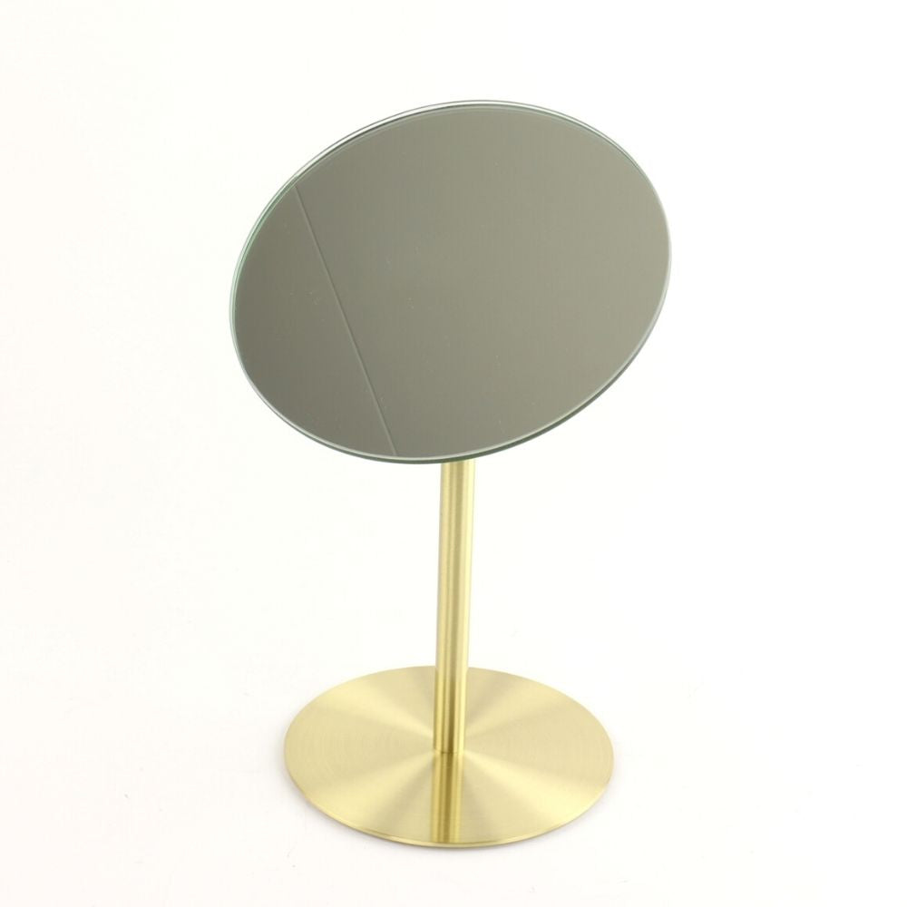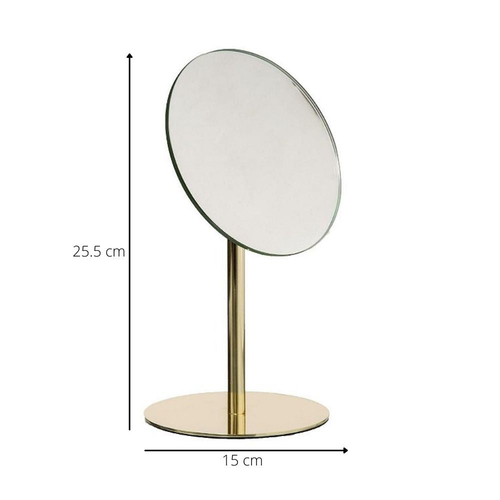 Deze spiegel van Orange85 heeft een gouden kleur. Deze staande spiegel is perfect in de badkamer bijvoorbeeld voor tijdens het opmaken. De spiegel staat op een houder en heeft daarmee een hoogte van 25.5 cm. De spiegel zelf heeft een diameter van 15 cm.